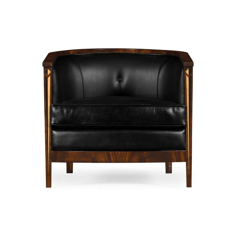 Biedermeier style brown mahogany tub chair, fully cream leather upholstered with geometric pattern inlay design to the sides and back. Inspired by European designs of the early 20th century.