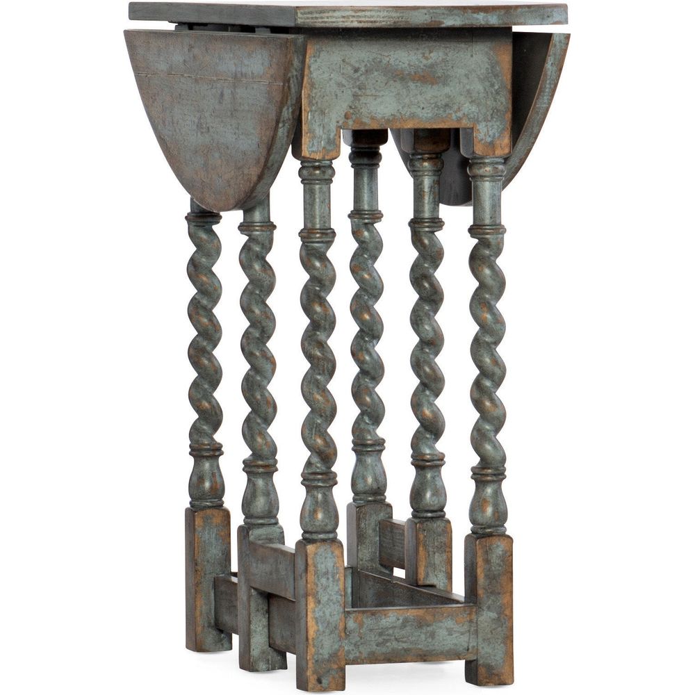 With chic curvy legs and a chunky base, the Prause Gate Leg Table is reminiscent of European antiques brought to this country by immigrants during the time of America's westward expansion. This character-filled piece is also practical. Put the drop leaves down for a snug fit next to the sofa, but raise them up to use this piece for an extra table top or serving surface. Finished in the dreamy Blue Bonnet, a soft blue accent finish with a rubbed patina and distressing. Taking the next step in creating a Hill Country family of collections, Hooker Furniture has introduced LaGrange. The anthology of bedroom, living room, dining room, occasional and home office furniture is inspired by the Hill Country region of Texas, including the town of LaGrange, one of the stops made by the Hooker Furniture design team in search of inspiration. The collection includes heavily distressed oak and hickory surfaces, extensive carving and scroll work, aged metals, sedimentary stone and primitive textiles. Each piece has a unique story to tell, while still retaining the authentic American character of the original collection. LaGrange is updated with a fresh new personality, brought to life by four distinctive finishes and modern conveniences for the lifestyles of today.