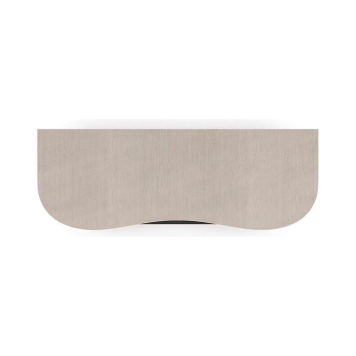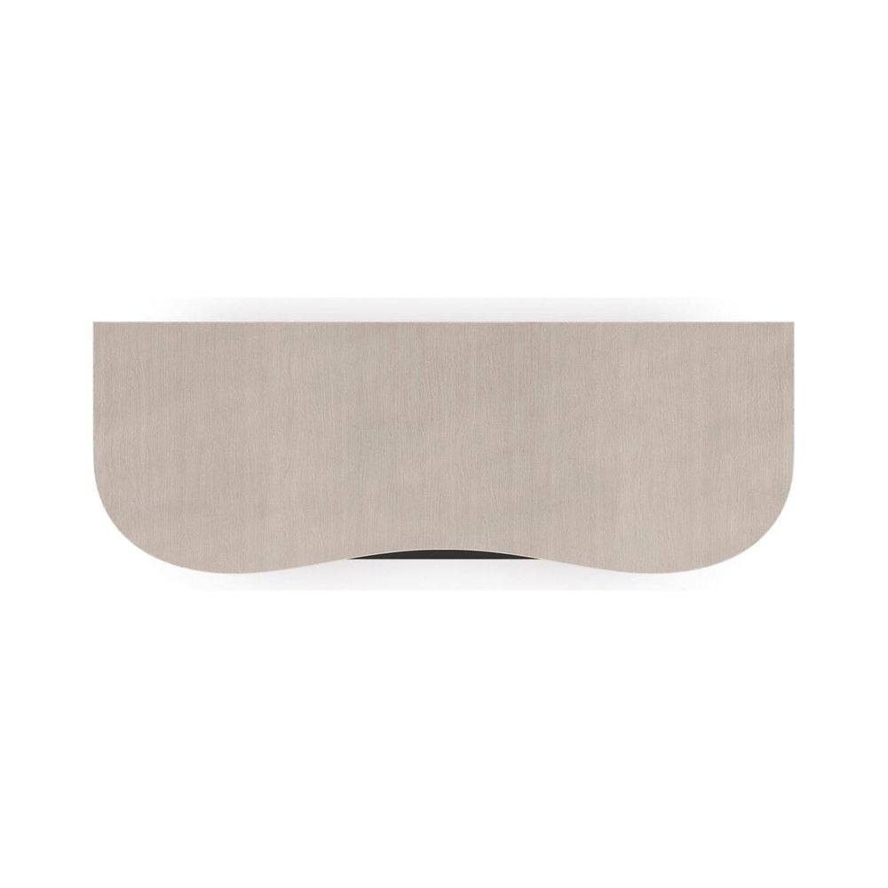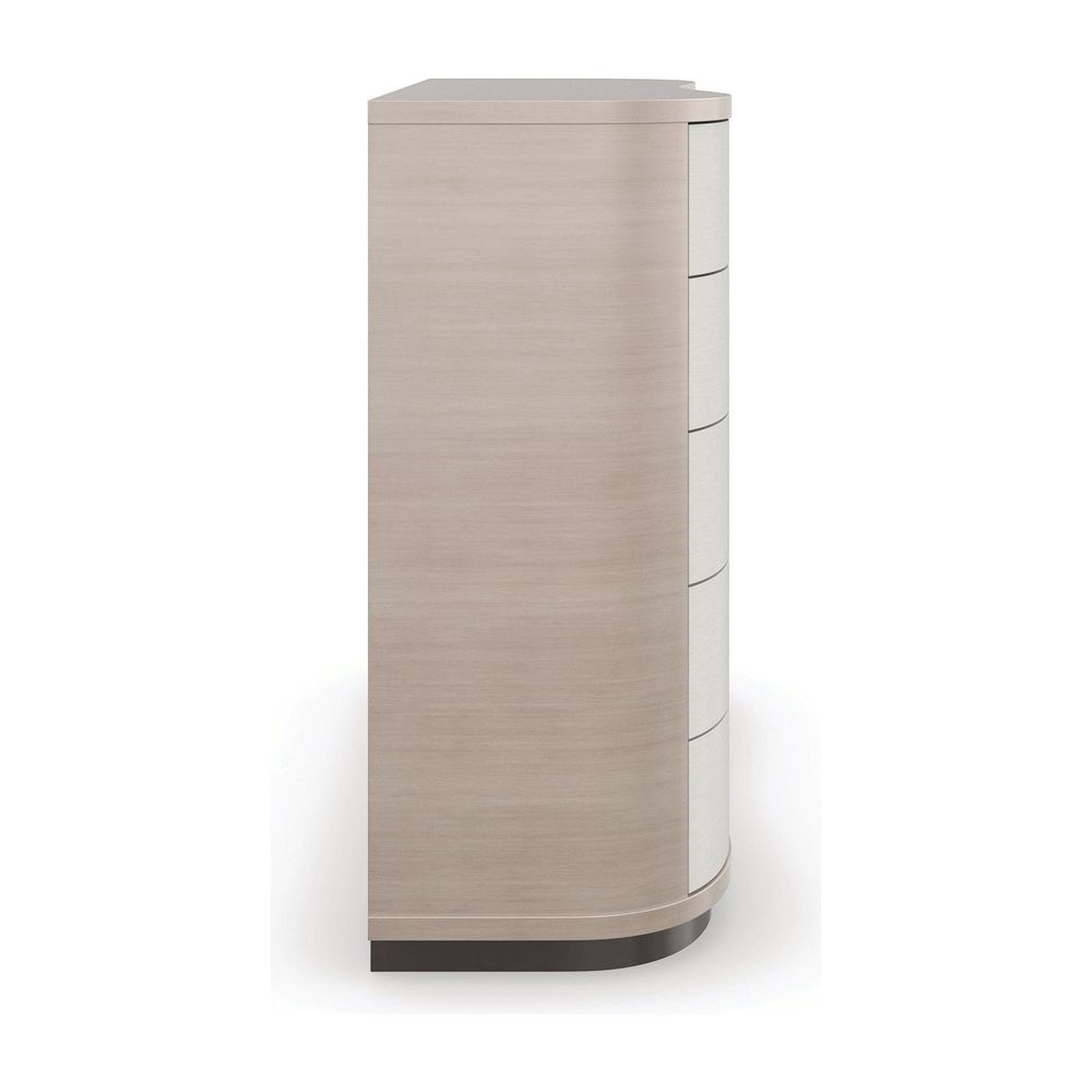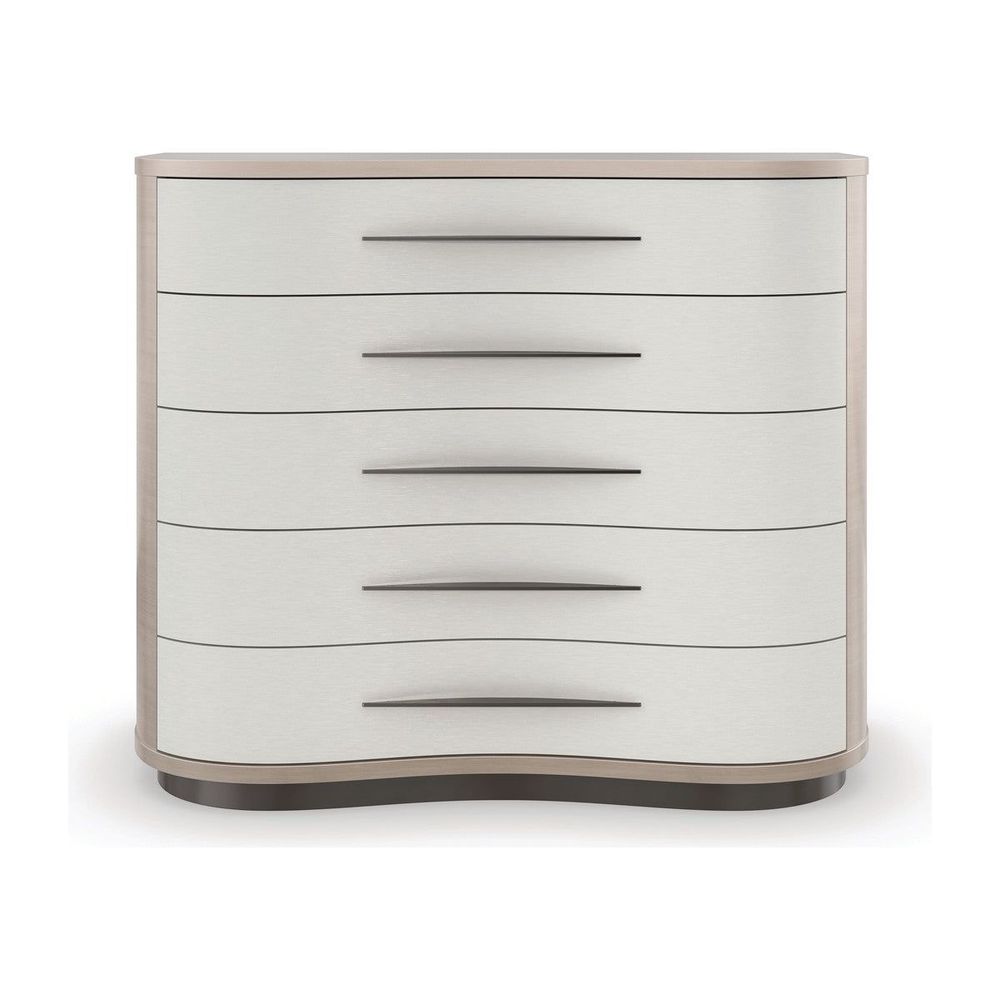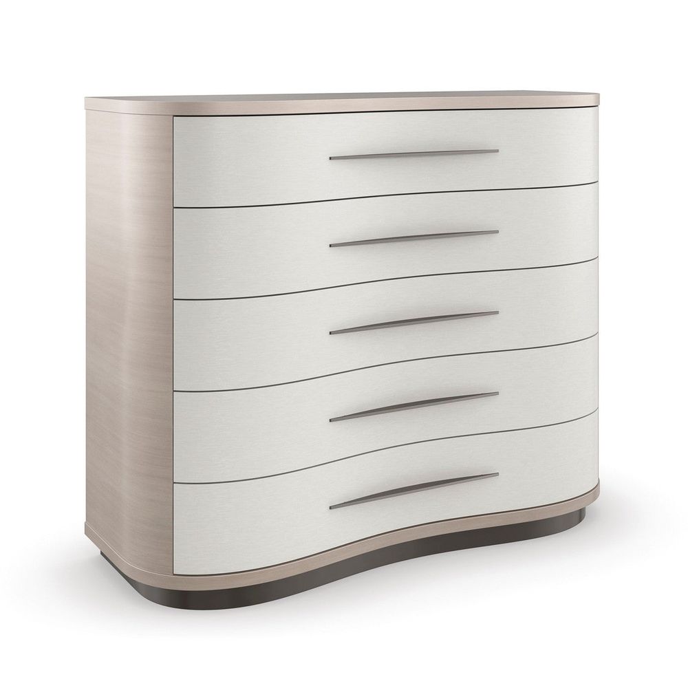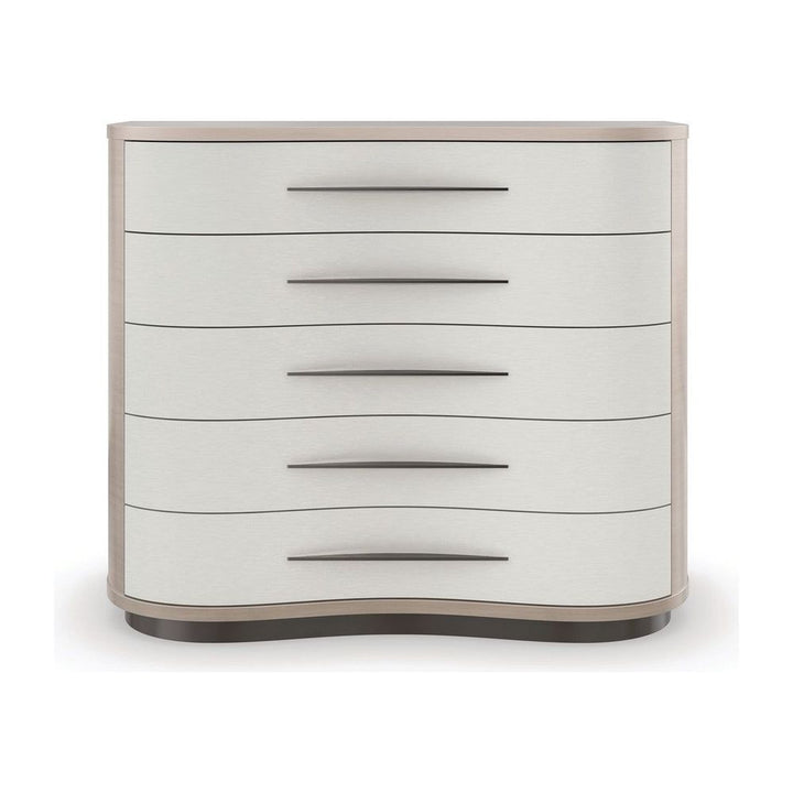 Free-flowing in nature, this sinuously shaped dresser makes a simple, yet elegant, organic statement. Vinyl-wrapped drawer fronts accentuate its gentle curvature and offer subtle contrast to Koto veneers in a pearlescent Moonstone finish. Five soft-close drawers offer tucked-away storage, with horizontal hardware and painted interiors for an unexpected finishing touch. A removable tray in the top drawer neatly keeps jewelry, trinkets, and cufflinks.