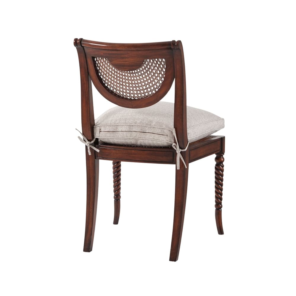 A Regency walnut side chair, bronze oval, caned back & grey silk cushion seat, spiral turned legs.The original Regency.