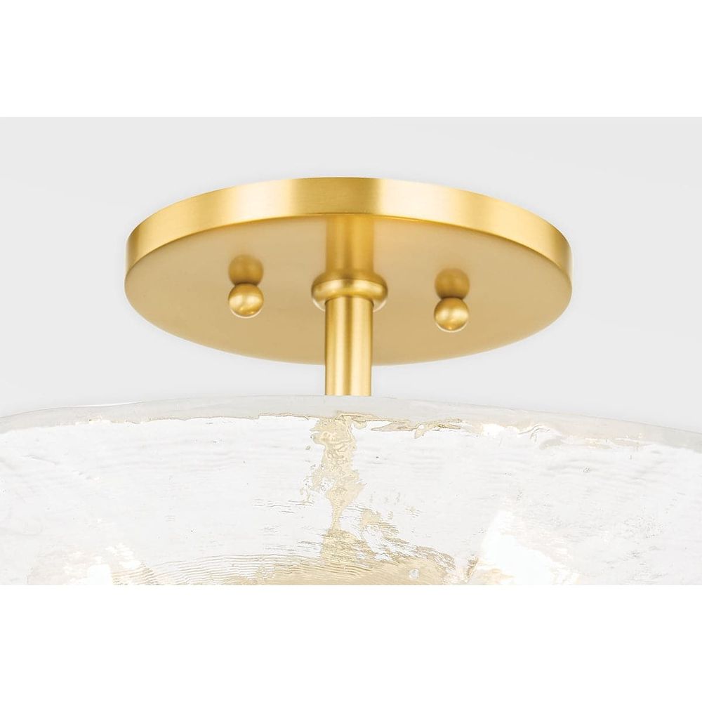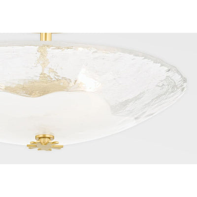Glass takes center stage in this exquisite flush mount. The round shade is made of a thick piece of hand-blown piastra glass, each with a unique, opaque Blonchino at the center. Mounted close to the ceiling, light fills the shade and reflects off the ceiling back into it, creating a mesmerizing, almost motion-like glow. The decorative aged brass finial adds to the piece's distinctive design.