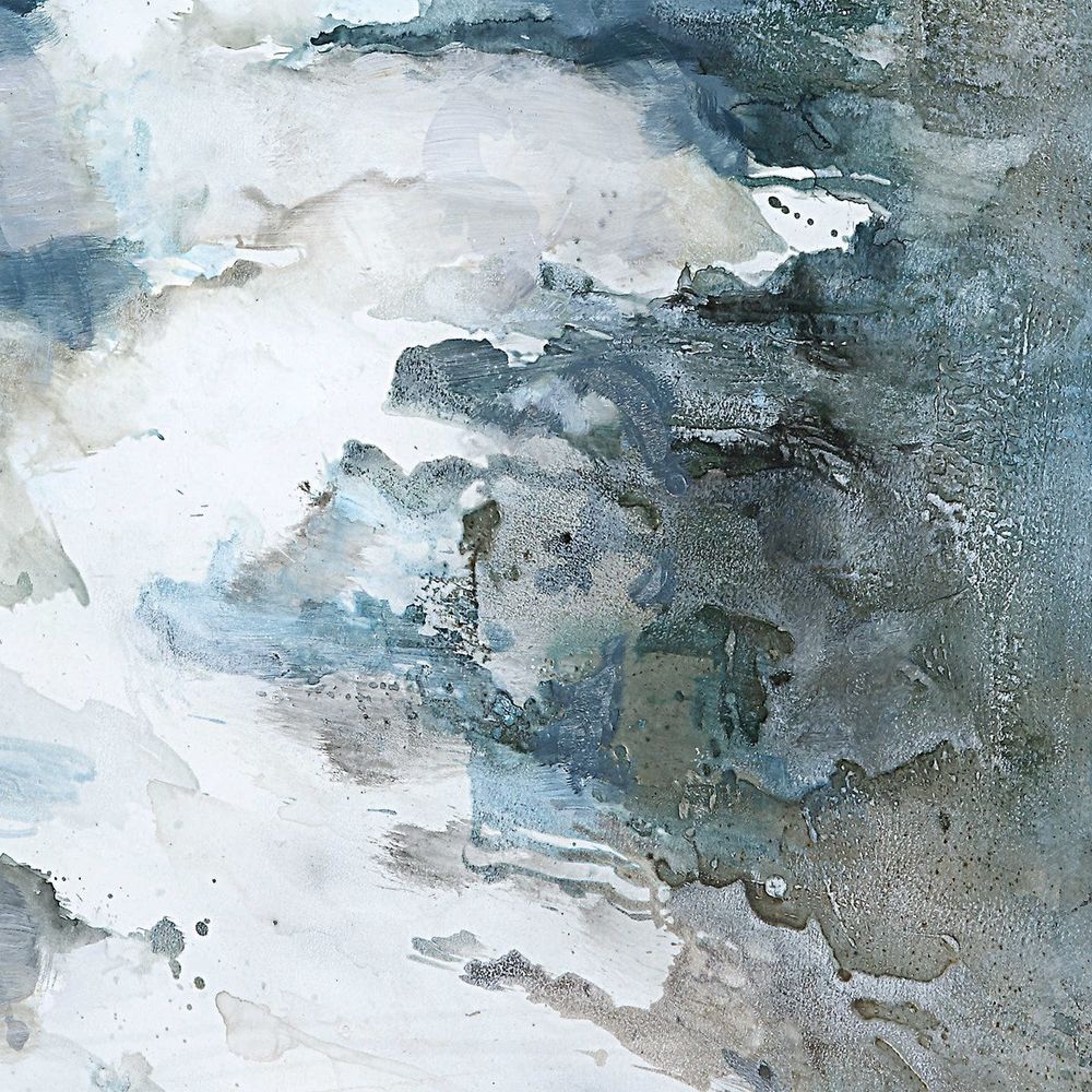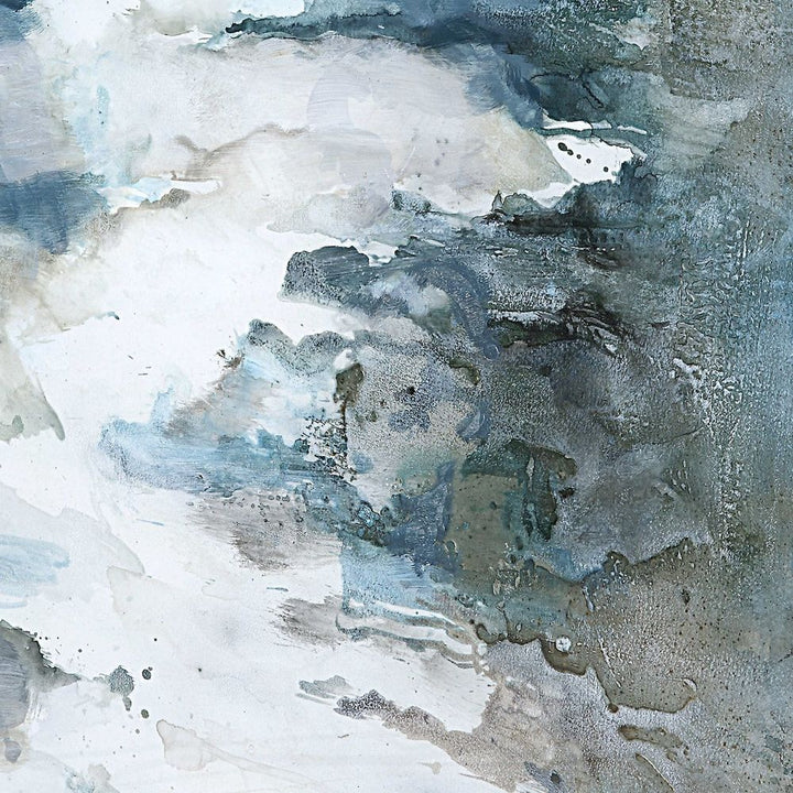Hand painted on a metal sheet, this contemporary artwork features shades of silver leaf, blue-green and white. Each piece is placed under glass in a black shadow box style frame against a white background. Due to the handcrafted nature of this artwork, each piece may have subtle differences.