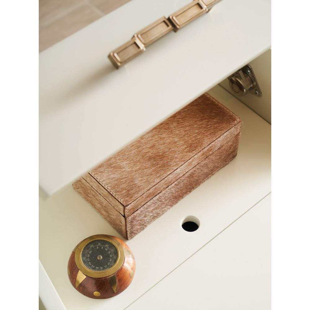 Feature 1: Contemporary designs in maple veneers and select hardwoods in a smooth ivory finish with custom hardware and decorative metal base in a warm silver leaf finish. Features include two soft close storage drawers and three lift lids on the desk top. The left and right open to concealed storage compartments while the center opens to two plug power supply with two USB charging jacks in a concealed compartment for cord management.