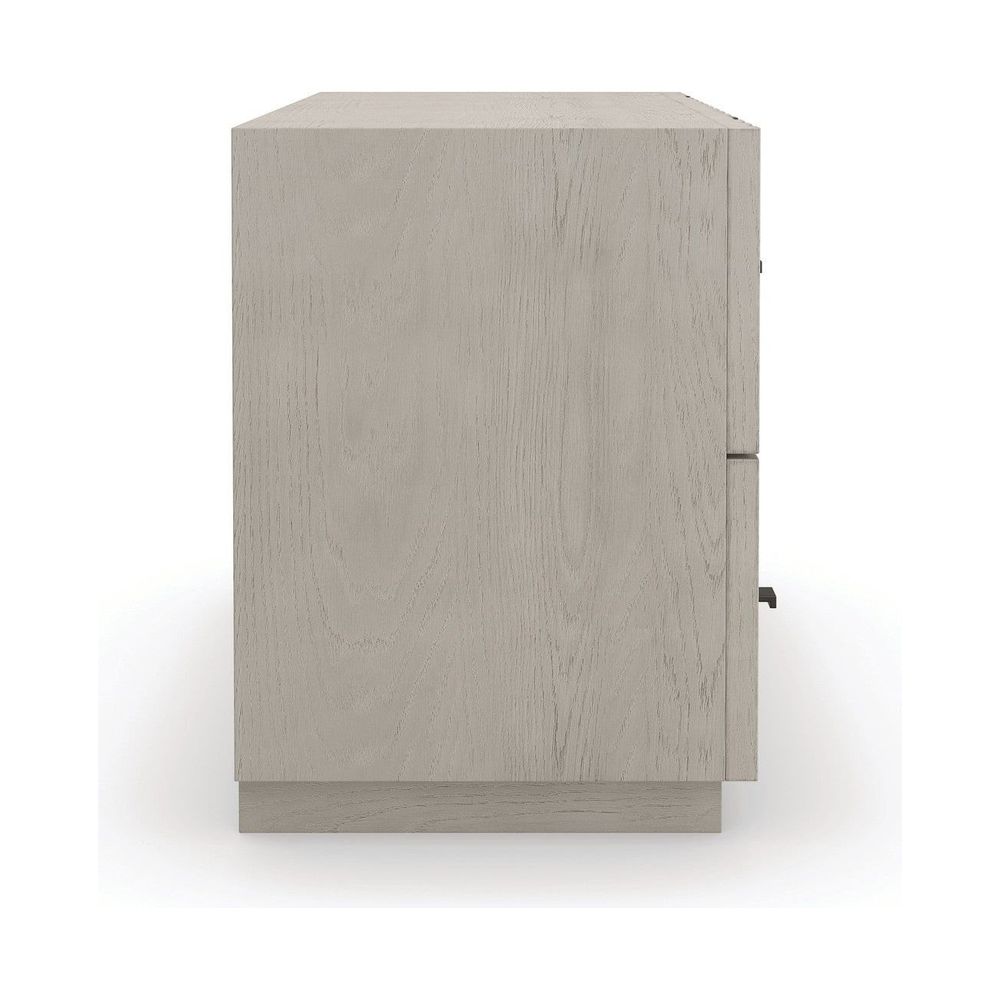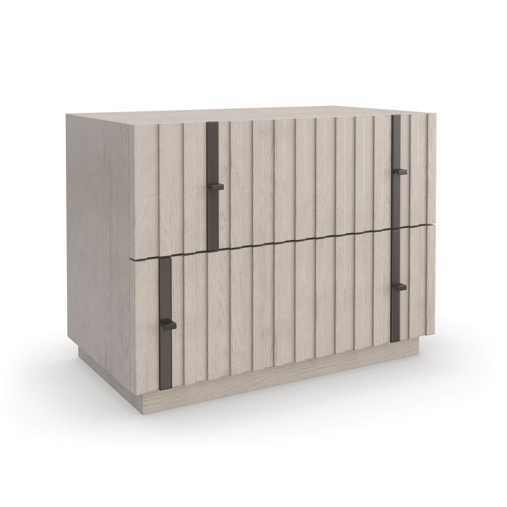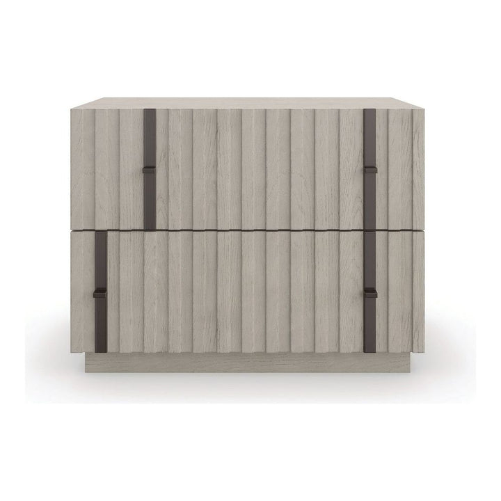Slat-detailed drawers make a striking statement, adding layers of visual texture and dimension to bedroom interiors. Crafted in open-grain oak veneers, the Clancy nightstand features two stacked drawers with minimal pull panels in matte black metal. Small Clancy nightstand also available.