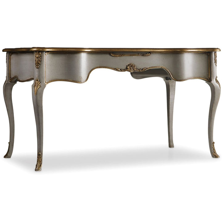 Crafted using hardwood solids this magnificent desk features a center drawer with drop-front for keyboard use and two utility drawers with one removable writing insert and pencil tray with felt bottom for use in either drawer, two removable dividers in each drawer.