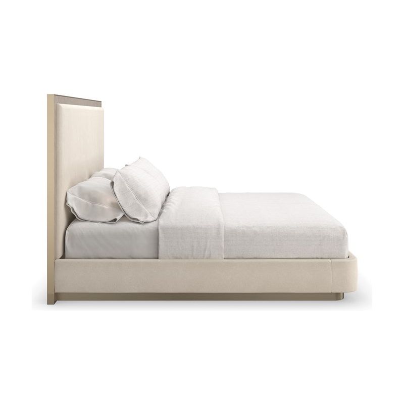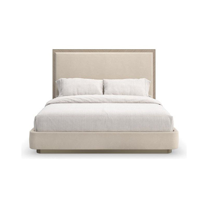 A storied collective of material and form, this classic bed introduces a calming neutral palette that is warm and inviting. Framed in Koto veneers with a subtle Chevron pattern inspired by early Greek motifs, its parsons-style headboard is dressed in a wool-like flannel that is soft yet durable and capped on all three sides in glinting Brushed Gold metal. Seemingly floating on a Brushed Gold plinth base, its sophisticated silhouette brings effortless elegance to bedroom interiors and guest suites. Also available with paneled, chevron-patterned headboard wings for added drama.
