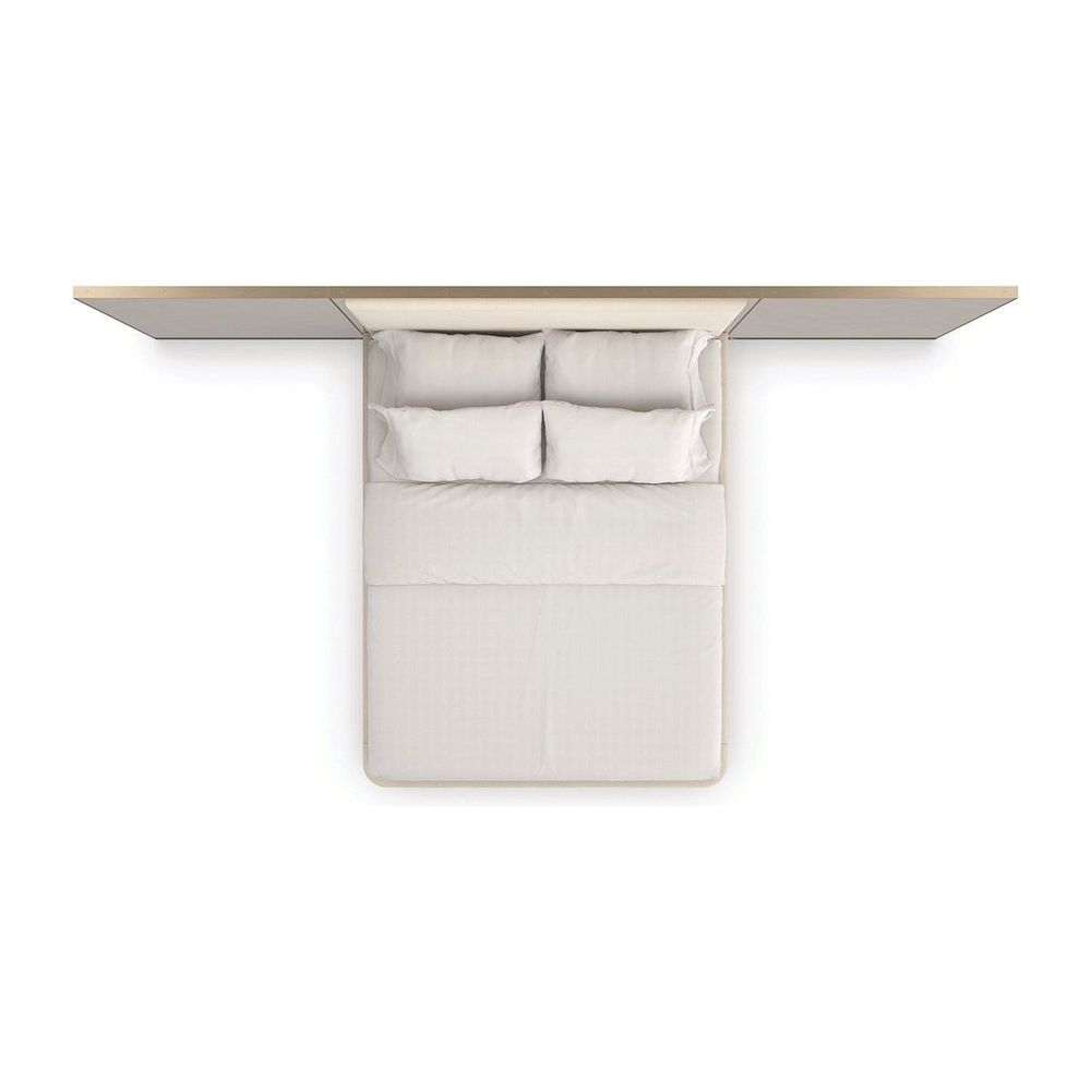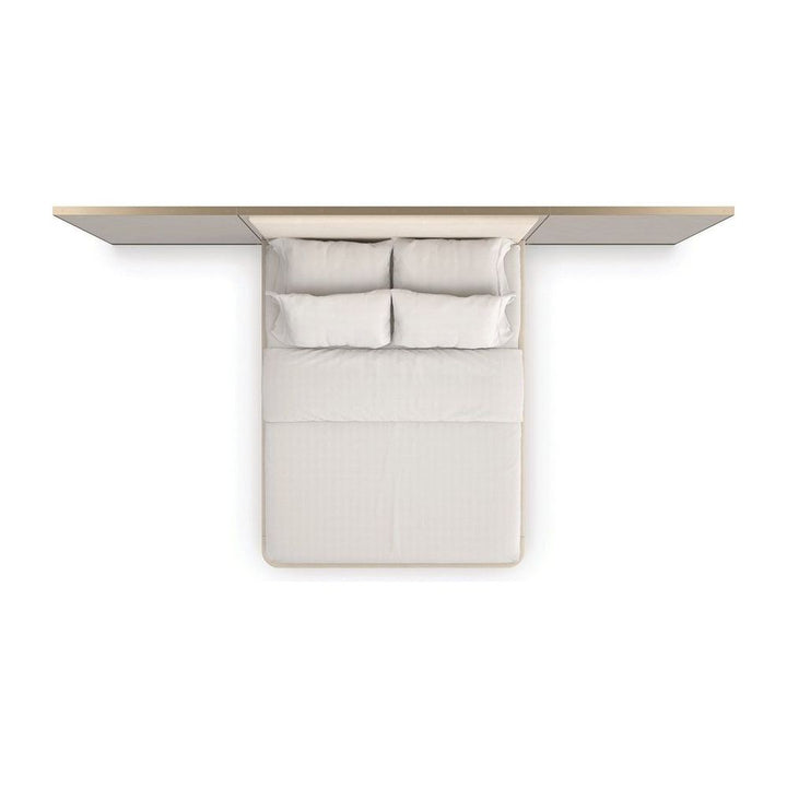 A storied collective of material and form, this classic bed introduces a calming neutral palette that is warm and inviting. Features paneled wings in Koto veneers with a Chevron pattern inspired by early Greek motifs, framing a parsons-style headboard dressed in a soft yet durable wool-like flannel. A metal spline in Brushed Gold lends separation and a hint of shimmer. Seemingly floating on a Brushed Gold plinth base, its sophisticated silhouette brings effortless elegance to bedroom interiors and guest suites.