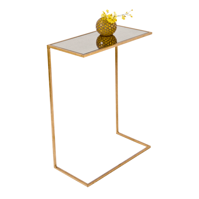 Description: Our petite Rico drink table is a perfect complement to any lounge area and so versatile, you'll want one for every setting. The unique base is designed to slide effortlessly beneath a sofa or side chair, so it can be pulled over to rest a drink (or your laptop!) on the rectangular, antique mirror top. A hand-finished gold leaf base completes the look.