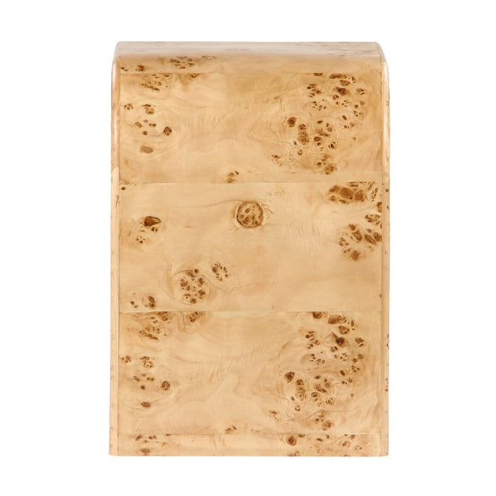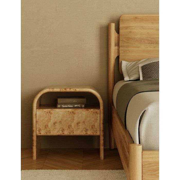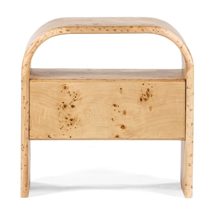 Description: The Liam Nightstand is a sculptural nightstand made in Burl veneer. Its curved top and clean design add a simplistic charm to your bedroom. Disclaimer: The natural burl patterns may vary from the imagery provided, resulting in unique product variations. Please note that no two products will be identical due to these natural variations.