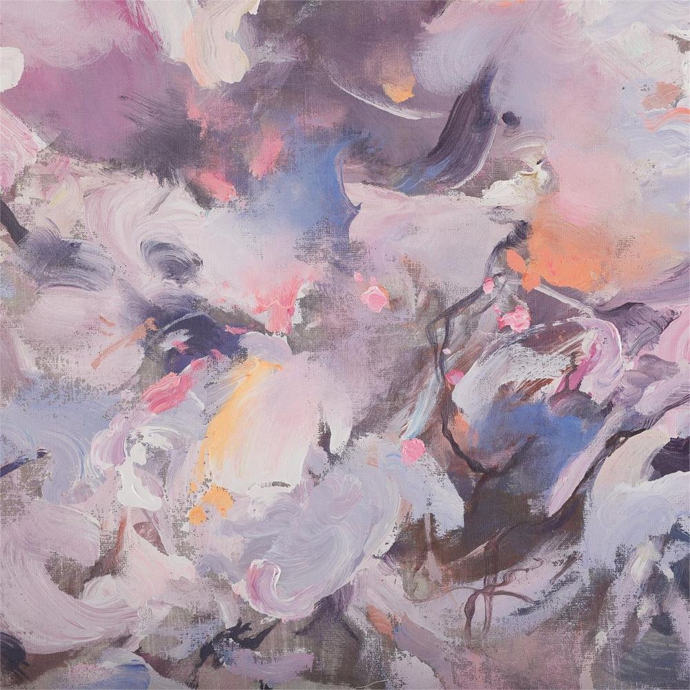 Floral Palette by artist Liang Fei is an oil painting on canvas that showcases abstract floral shapes in vibrant whites, pinks, and purples. This stunning work of art is displayed within a black floater frame.