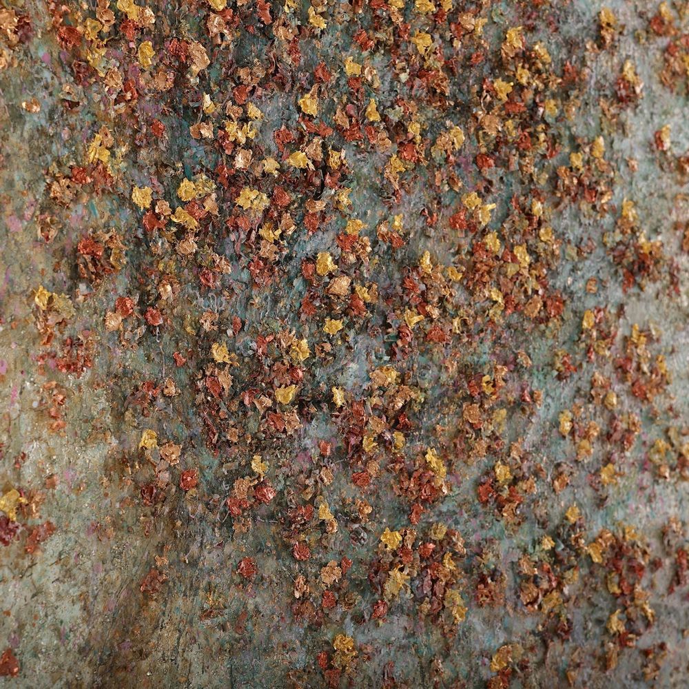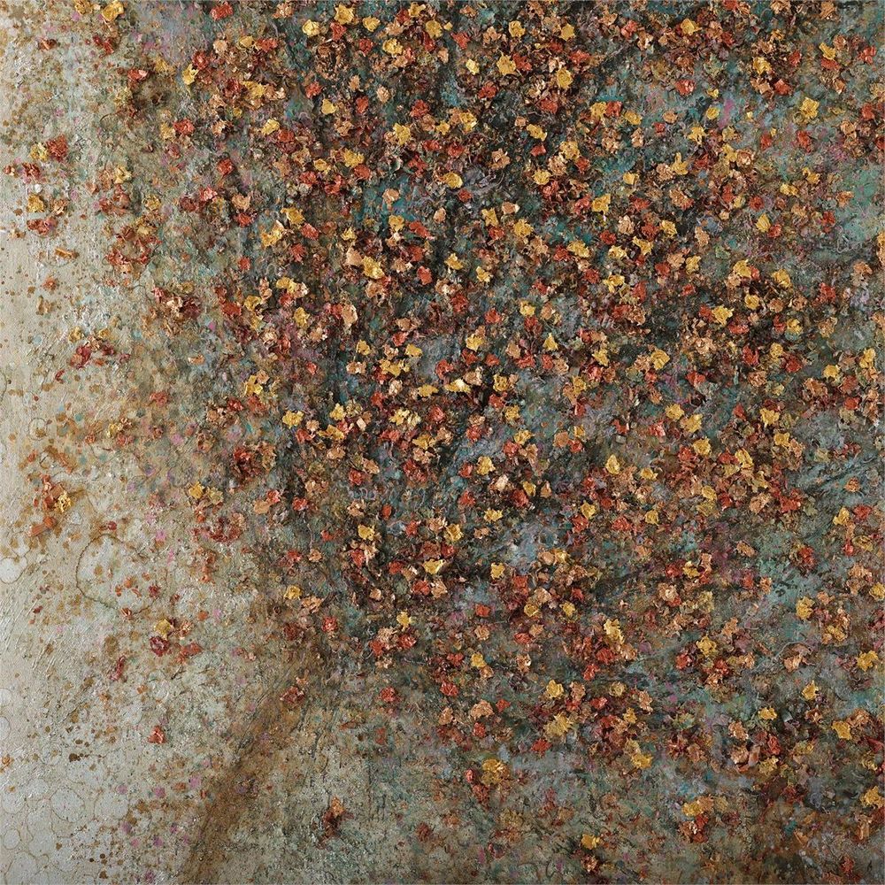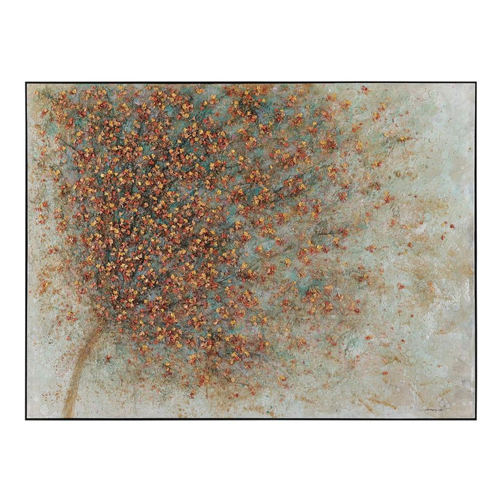 Scattered to the Wind by artist Liang Fei is an elegant oil painting on canvas, depicting a stunning tree overlain with dimensional leaves. This beautiful natural motif is displayed from a black floater frame.