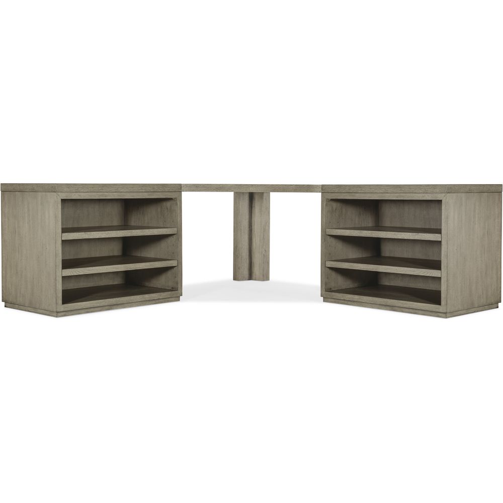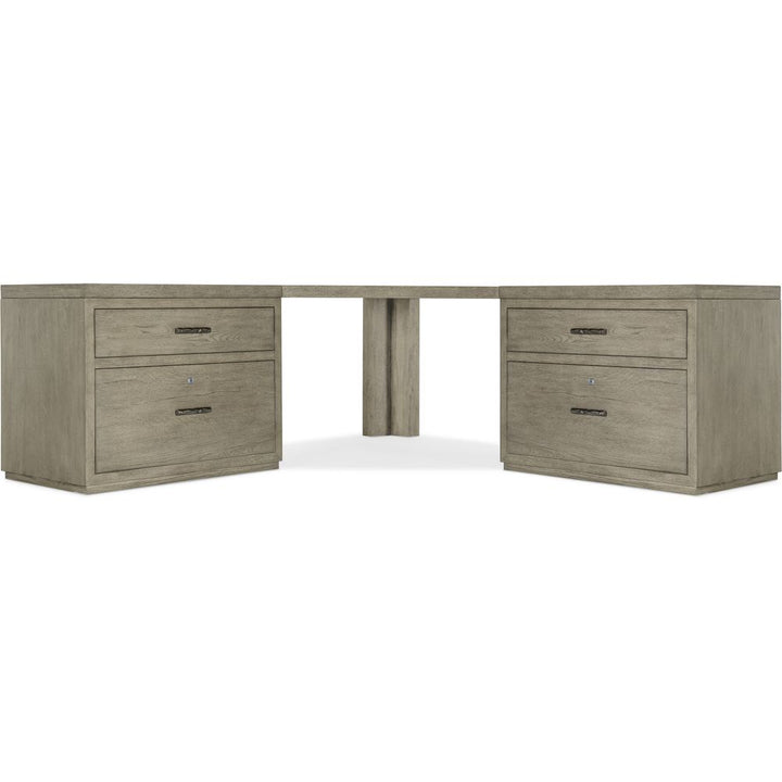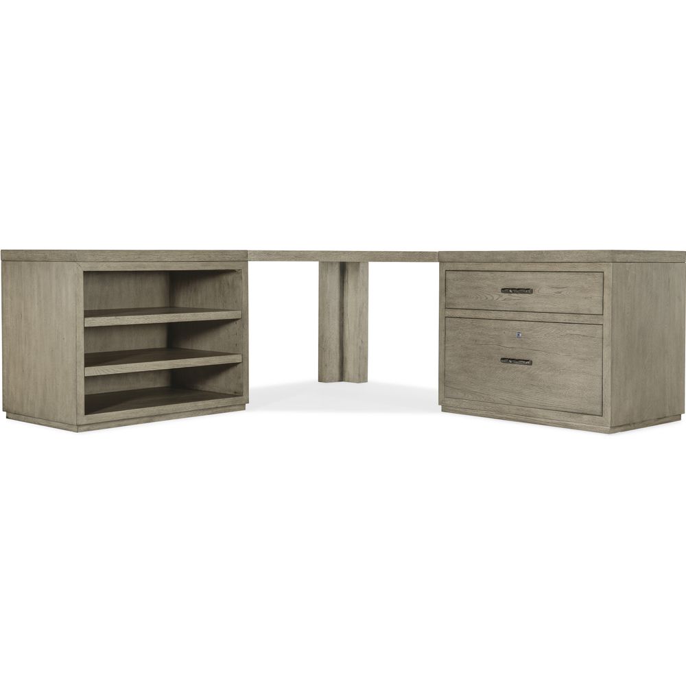 The stylish symmetry of the Linville Falls Corner Desk will bring serenity to your life and productivity to your work. Capturing the essence of nature's organic color palette on a clean-lined, simple silhouette, the unit is crafted of Oak Veneers with a soft smoked gray Mink finish, and combines a corner top with two flanking 36-inch tops. The unit's functional appeal is enhanced by two lateral files with a total of four drawers, including two top utility drawers and two bottom locking file drawers with pendaflex filing systems. Fully finished on the back so it can be floated in a room. Capturing the essence of nature's organic color palette and the aura of a rustic mountain cottage, Hooker Furniture introduces the Linville Falls collection. The whole home collection is designed for younger consumers looking for casual and contemporary furniture. Characterized by its rustic, weathered finish and clean lines paired with organic grain patterns, Linville Falls is constructed with split oak solids and veneers and has an overall organic aesthetic. It is featured in a soft Smoked Gray finish mixed with a Charred Black finish that is achieved through Shou Sugi Ban, a Japanese technique that creates an elegant burnt wood look. Its moderate scaling and fresh silhouettes offer a refreshing juxtaposition mixing old with new.