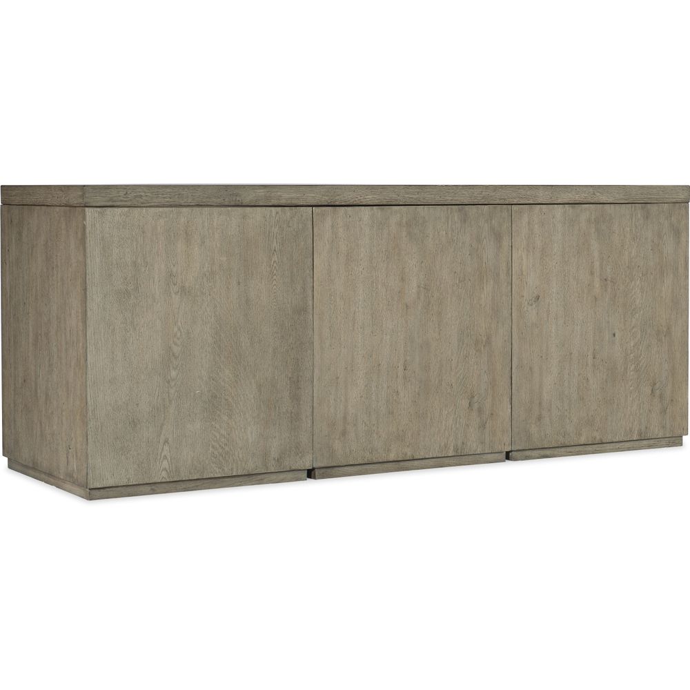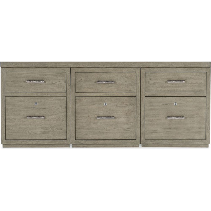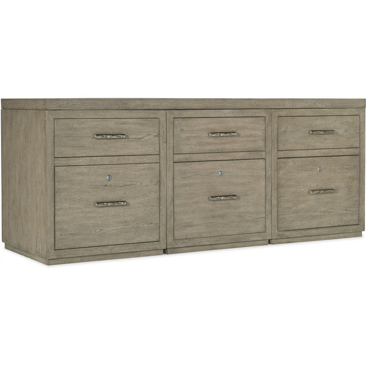 with a rustic weathered finish and clean modern lines, the Linville Falls Credenza includes a 72-inch top and three small files packed with function. Offering a total of 6 drawers, the top drawers are utility drawers and the bottom drawers are locking file drawers with pendaflex filing systems. Crafted of Oak Veneers, the credenza is finished in Mink, a soft smoked gray, and accented with textured metal bar pulls in an antique pewter finish. Capturing the essence of nature's organic color palette and the aura of a rustic mountain cottage, Hooker Furniture introduces the Linville Falls collection. The whole home collection is designed for younger consumers looking for casual and contemporary furniture. Characterized by its rustic, weathered finish and clean lines paired with organic grain patterns, Linville Falls is constructed with split oak solids and veneers and has an overall organic aesthetic. It is featured in a soft Smoked Gray finish mixed with a Charred Black finish that is achieved through Shou Sugi Ban, a Japanese technique that creates an elegant burnt wood look. Its moderate scaling and fresh silhouettes offer a refreshing juxtaposition mixing old with new.