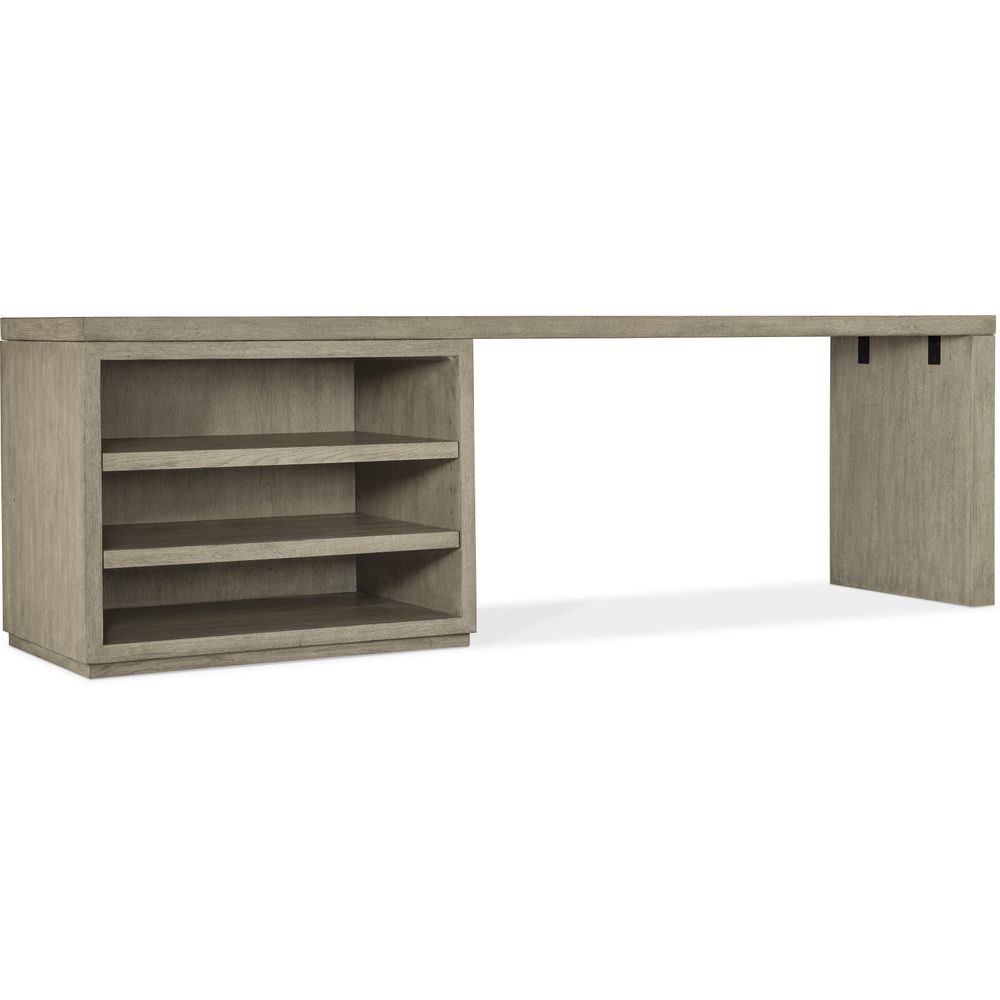 Capturing the essence of nature's organic color palette on a clean-lined, simple silhouette, the Linville Falls desk is crafted of Oak Veneers with a soft smoked gray Mink finish. The expansive 96-inch wide top has a functional base including an open desk cabinet with two adjustable shelves, and a leg end panel. The desk is fully finished on the back so it can be floated in a room. Capturing the essence of nature's organic color palette and the aura of a rustic mountain cottage, Hooker Furniture introduces the Linville Falls collection. The whole home collection is designed for younger consumers looking for casual and contemporary furniture. Characterized by its rustic, weathered finish and clean lines paired with organic grain patterns, Linville Falls is constructed with split oak solids and veneers and has an overall organic aesthetic. It is featured in a soft Smoked Gray finish mixed with a Charred Black finish that is achieved through Shou Sugi Ban, a Japanese technique that creates an elegant burnt wood look. Its moderate scaling and fresh silhouettes offer a refreshing juxtaposition mixing old with new.