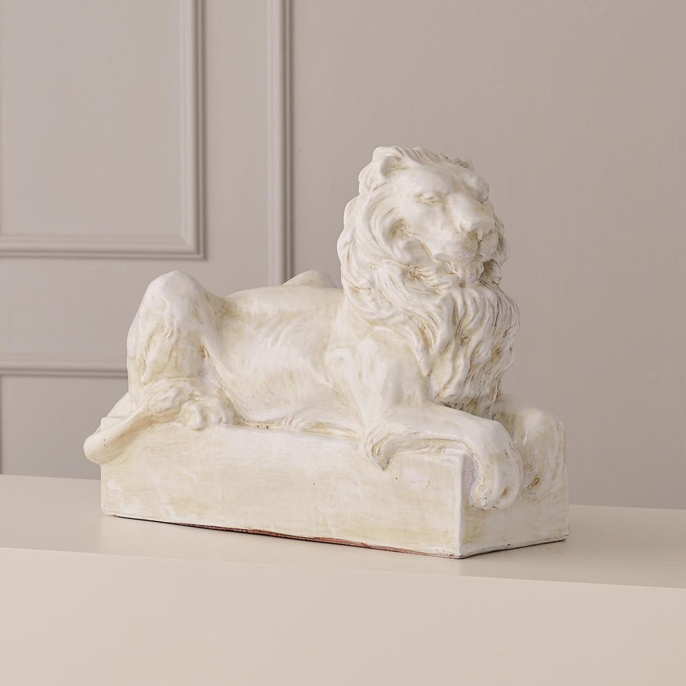 From the mind and imagination of George Sellers, our in-house sculpture and design director and a mound of clay comes a carved original model of this reclining lion. The original was then cast in plaster and sent to a factory in Italy to be produced in a terracotta based ceramic material in the technique Italians call "calco", whereby terracotta ceramic is packed when wet into a detailed mold. Drying over time, the terracotta ceramic pulls away from the wall of the mold and removed to be fired in a 950 degree kiln, then fired a 2nd time after being glazed in our signature antique white glaze. A design trend and direction we believe in as a company is a return to classicism as inspiration for the future of home decor.