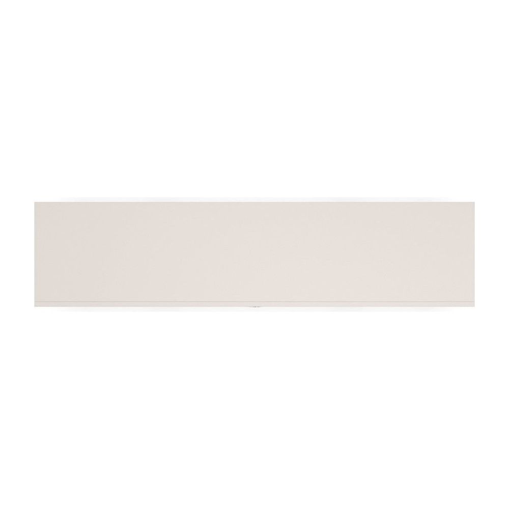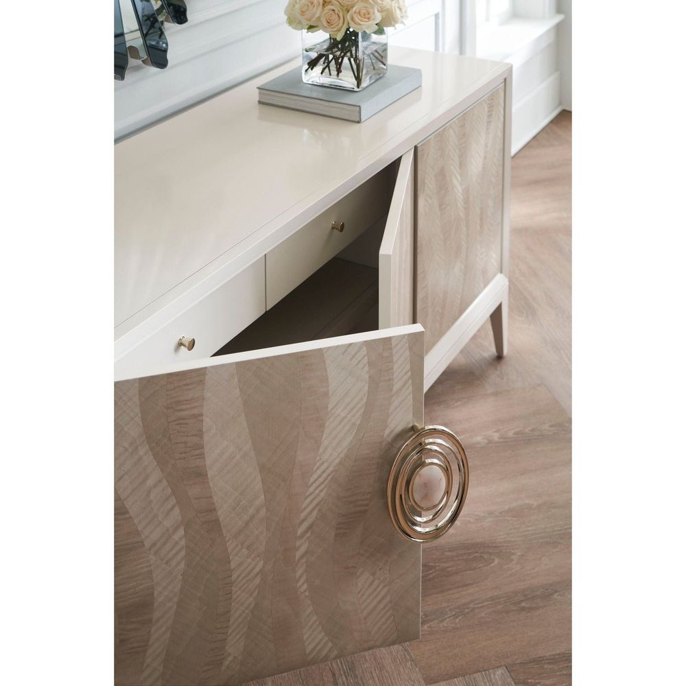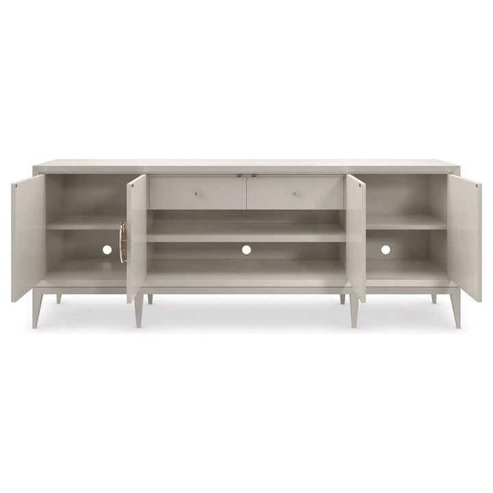Features: Case in Almond Milk.Four doors with fronts in Chinchilla with touch latch on outside doors.Behind each outer door is an adjustable shelf. Behind center doors is an adjustable shelf and two doors with side guides.Interior in Almond Milk.Wire management holes.Hardware on center doors in Whisper of Gold with resin inlay.