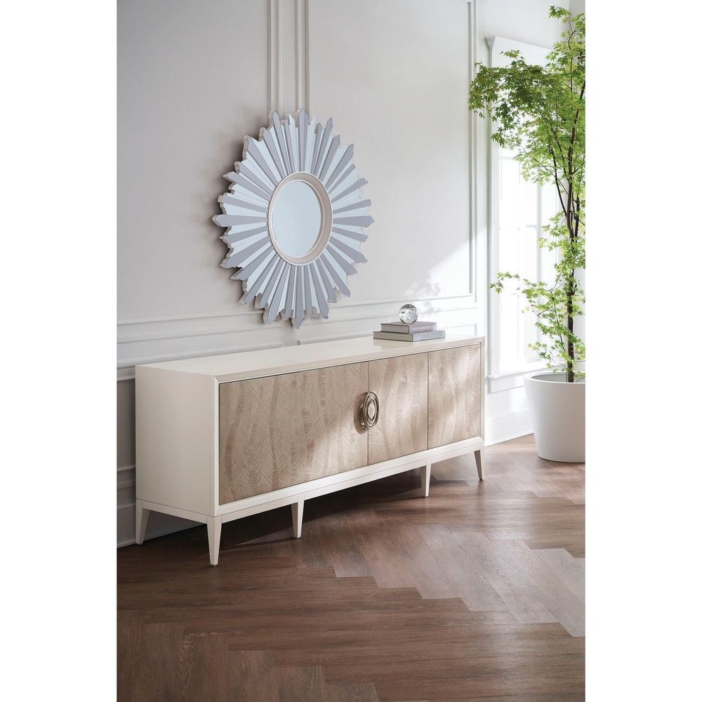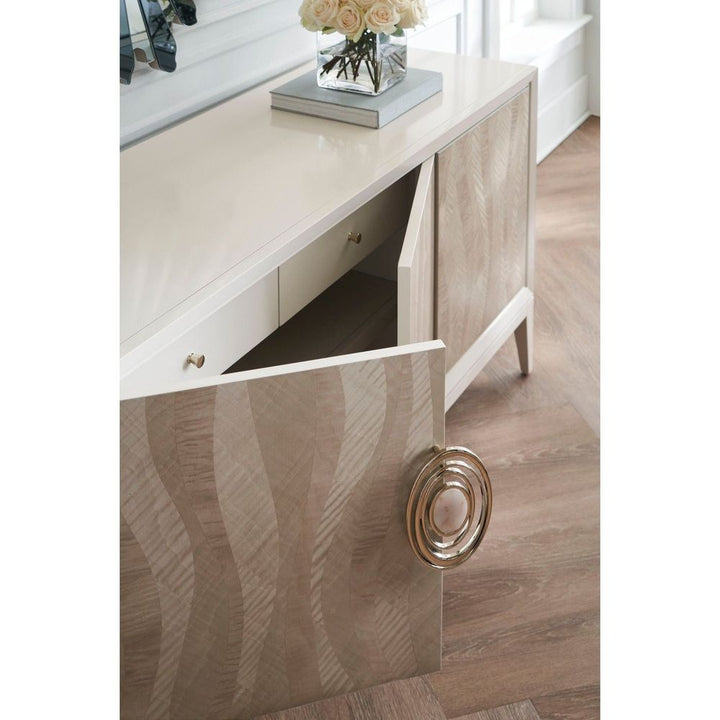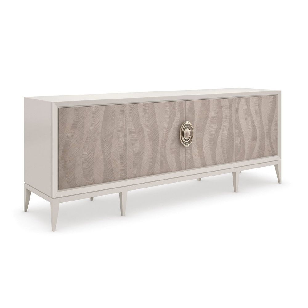 With a rhythmic pattern reminiscent of rippling stream water, this statement-making console merges organic elements with luxe touches. Features touch-latch doors, intricately crafted from grey curly maple veneers in a warm Chinchilla finish, artfully accentuated by jewelry-like hardware in a Whisper of Gold. Complementing its Almond Milk frame, a painted interior features generous storage, with adjustable shelves, center drawers, and cutouts for wire management.