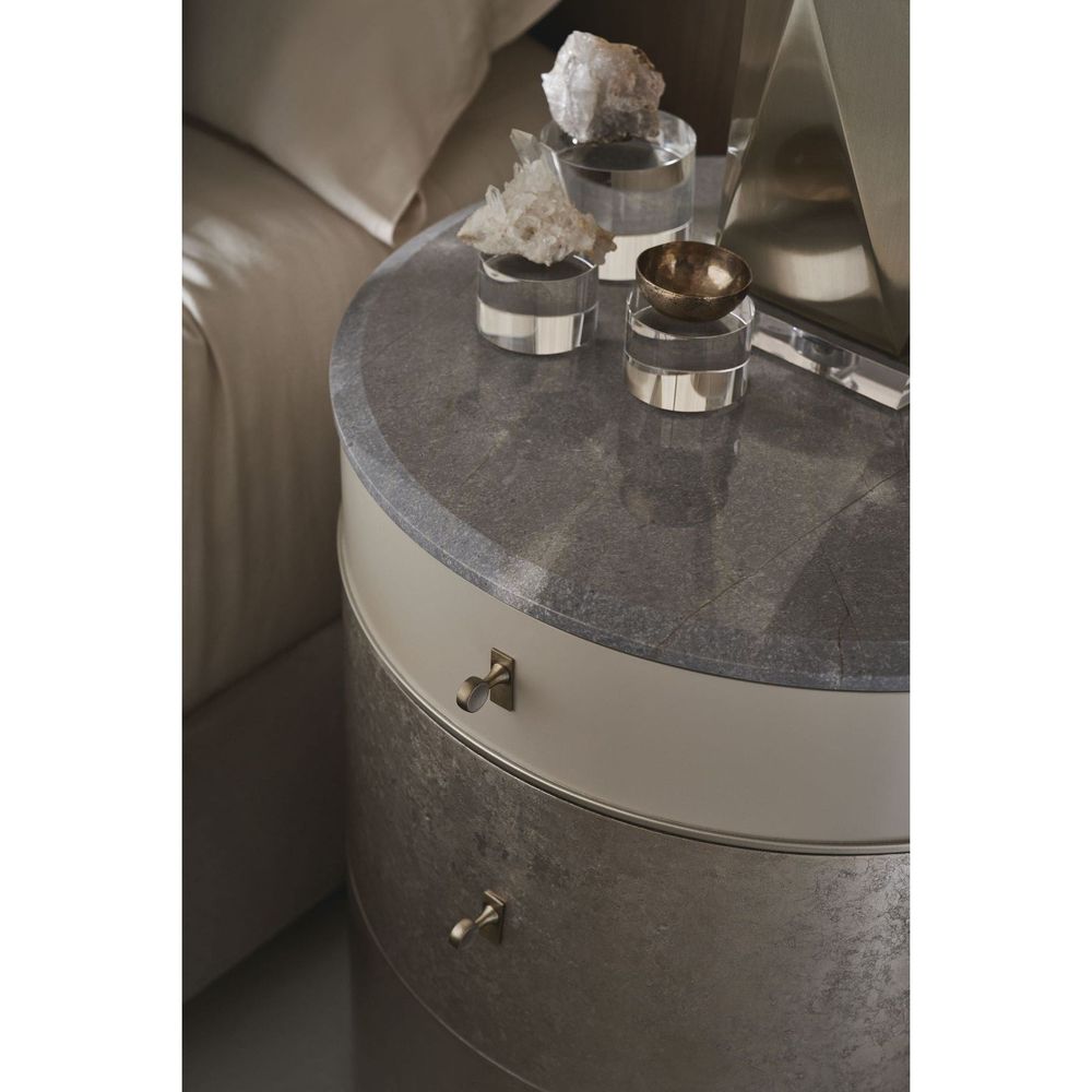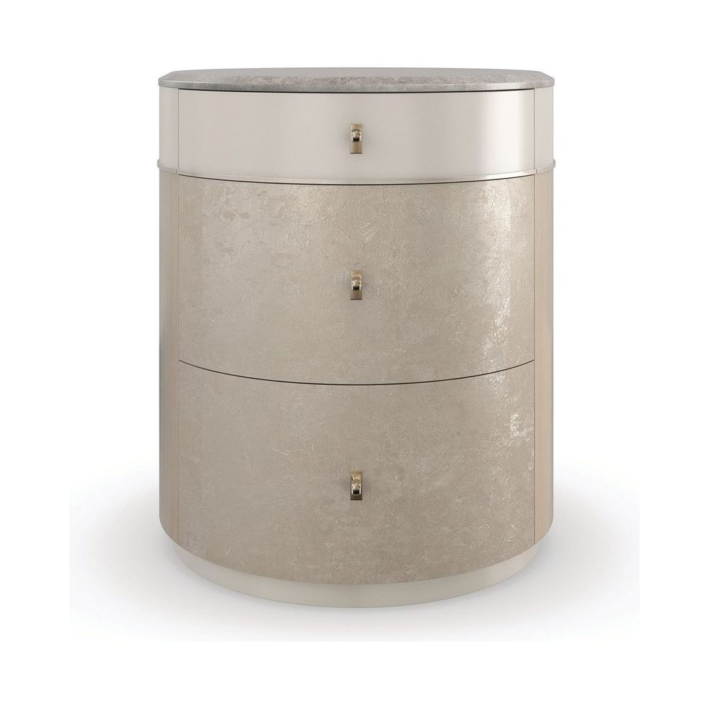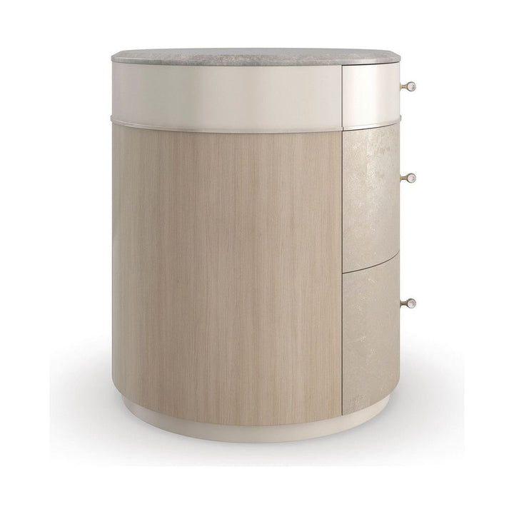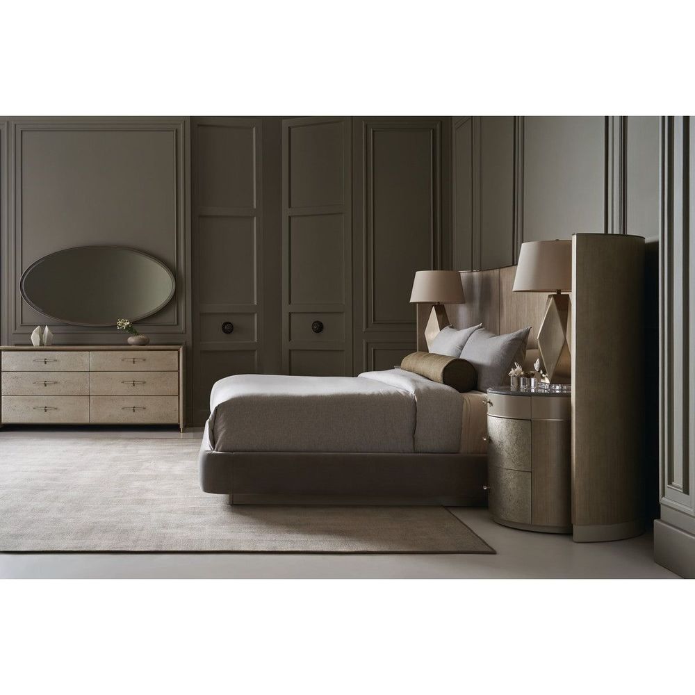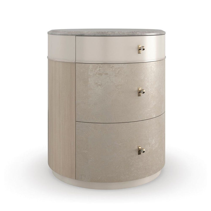 Designed to perfectly nestle within the wings of our Dream Chaser bed, or make a captivating statement on its own, the Hang Around nightstand introduces a refined mix of materials and finishes. Its gracefully curved shape is defined by a slender top drawer in a calming Cloud finish and two bottom drawers in a broken metallic leaf that recalls the shimmer of a frost-covered, candle lit window. Encased in Dry Martini to illuminate the natural beauty of Koto veneers.