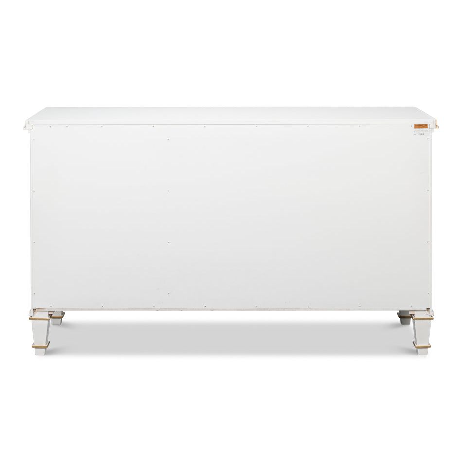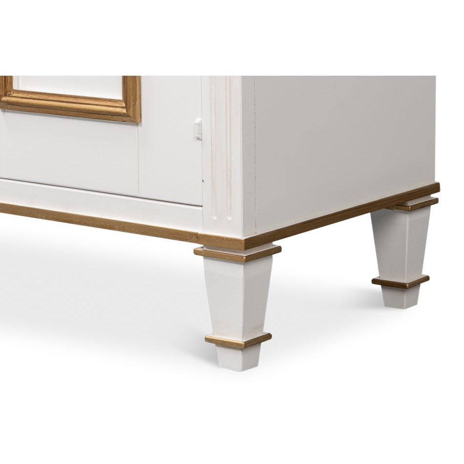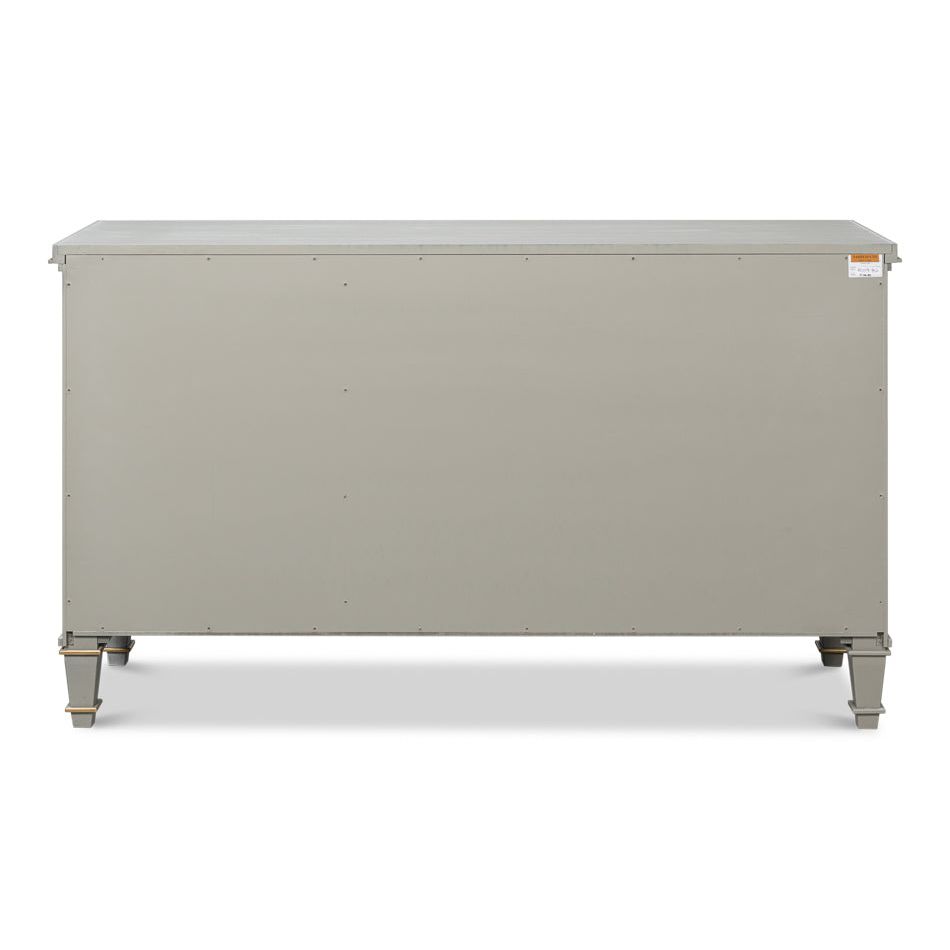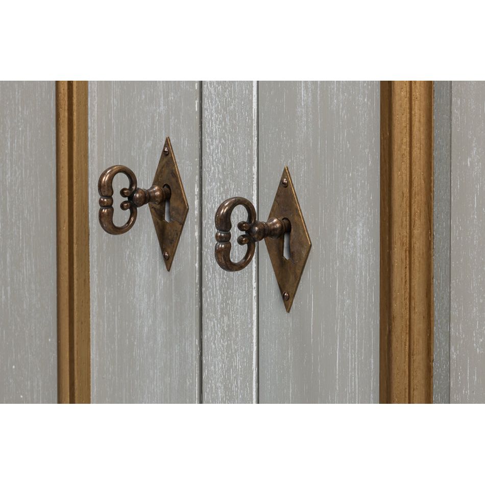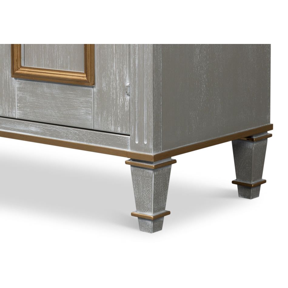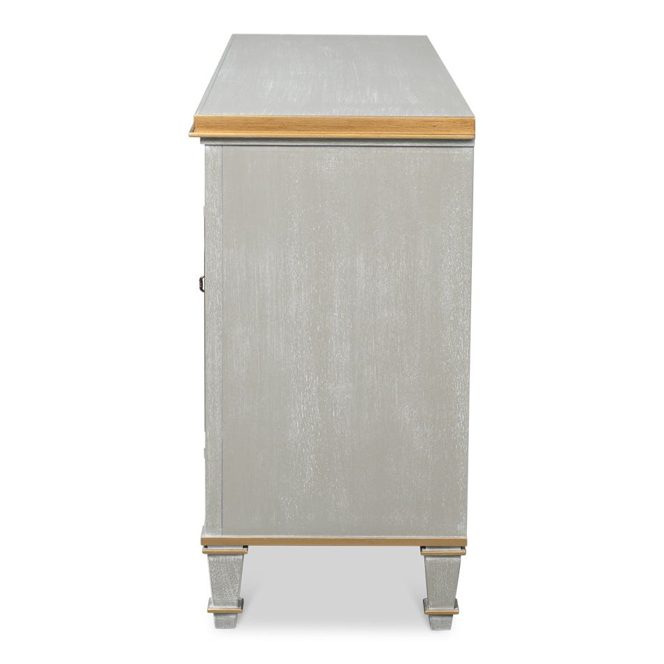 The handcrafted rich gray Carmine Legno finish and gold tones of this buffet are only part of it"s appeal. Three doors with applied panel molding on each with escutcheon and key pulls opens to two adjustable shelves. There are details to appreciate everywhere.