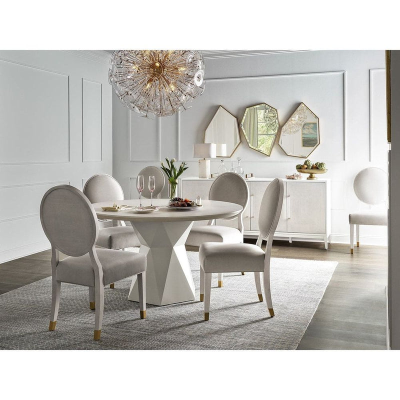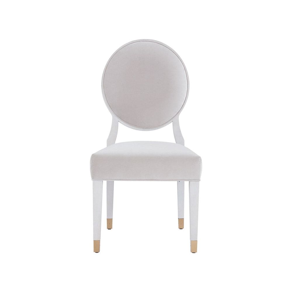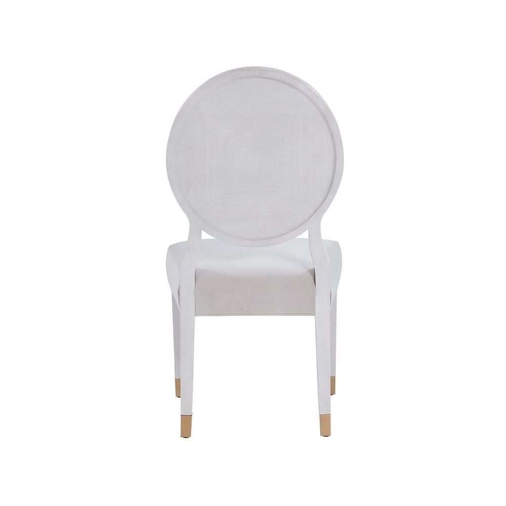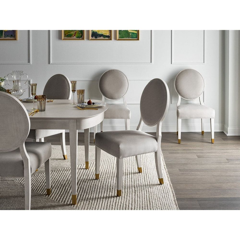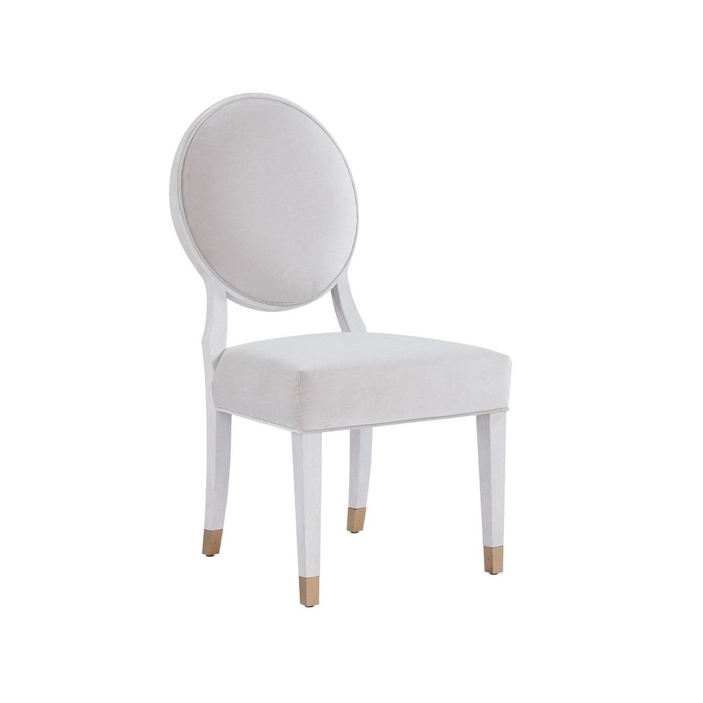 Boasting an exquisite rounded back, an upholstered seat, and soft gold metal caps on each leg, the Love Joy Bliss Oval Side Chair is a luxe seating choice.