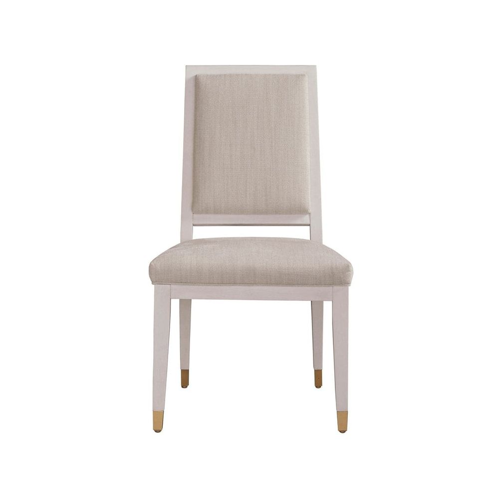 Sprinkle style around your dining table with the Love Joy Bliss Side Chair, which is upholstered in a Woven Pewter fabric, features an Alabaster finish, and is perfected with soft gold metal caps on each leg.