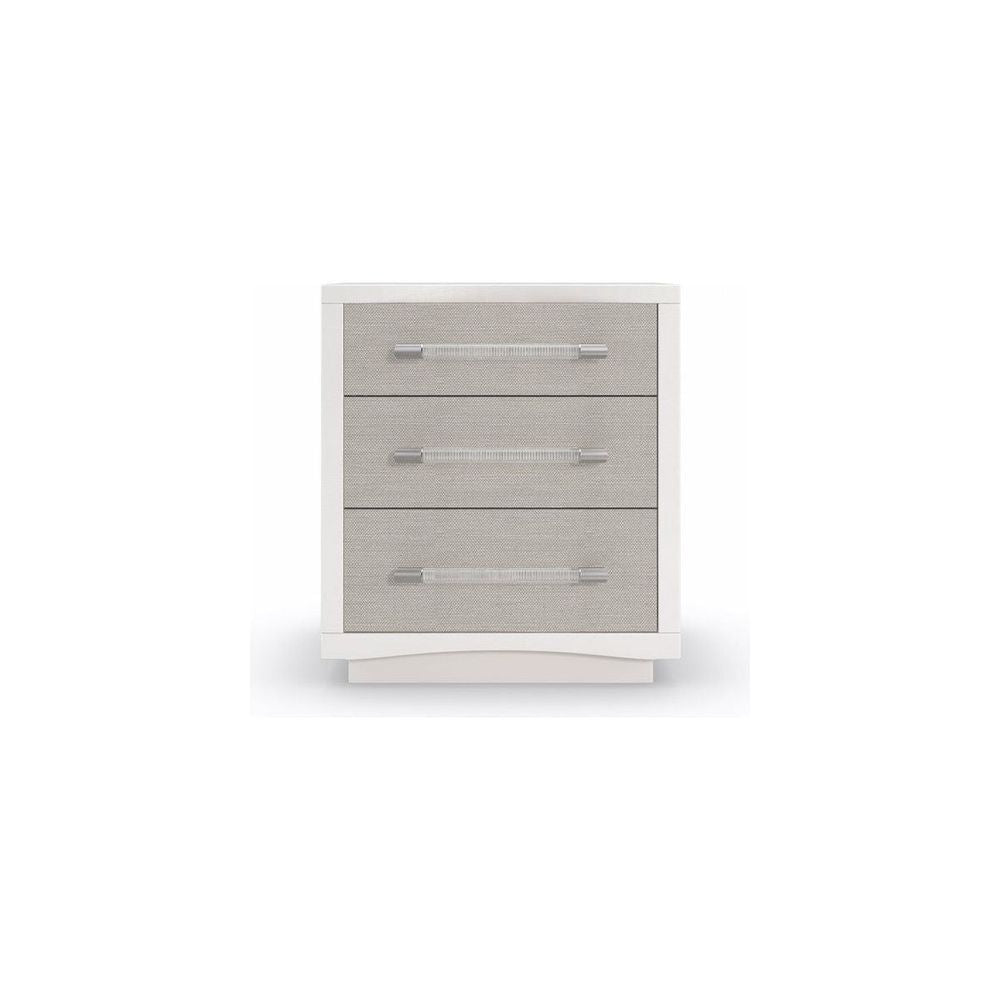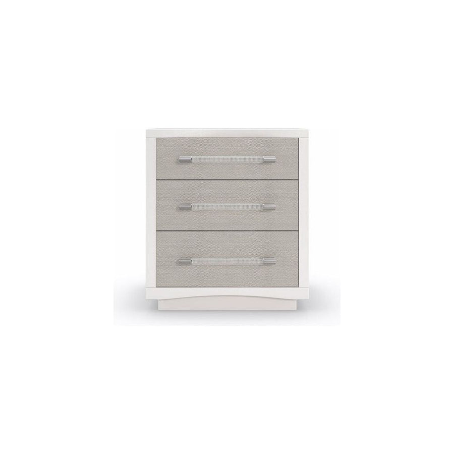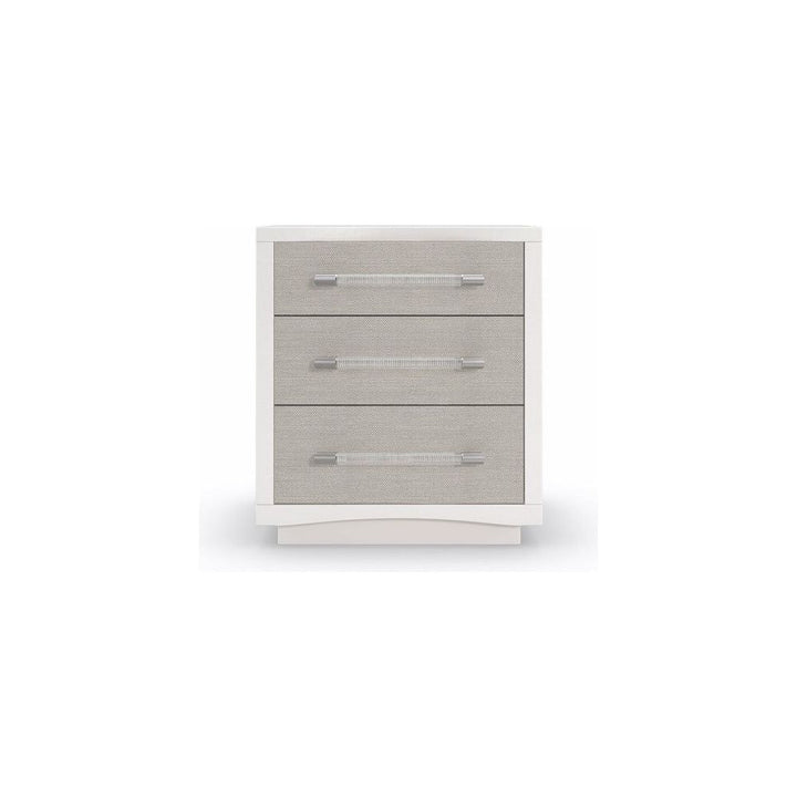 Features: Case in Pearly White Textured.Three drawers with raffia fronts in Sun-kissed Silver and soft close undermount guides.Drawer interior in Pearly White Smooth.Wire management holes in back panel.USB port
