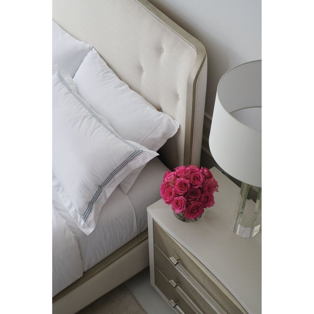 This elegant bedside table introduces a softly textured, metallic element with inherent organic character. Woven raffia drawer fronts are reimagined in Sun-kissed Silver, complemented by ash veneers in a Pearly White finish. For a distinctive finishing touch: clear acrylic drawer handles are capped in ribbed stainless steel. Features a USB port on the back for convenient charging and cutouts for wire management.