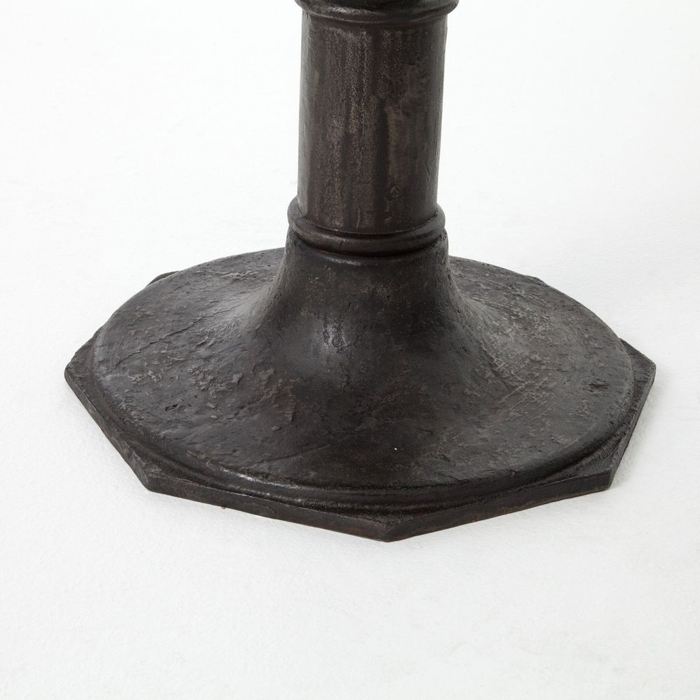 Description: French-industrial meets bistro table. Detailed, 8-sided cast iron pedestal supports a dramatic white marble top with bull-nosed edge.