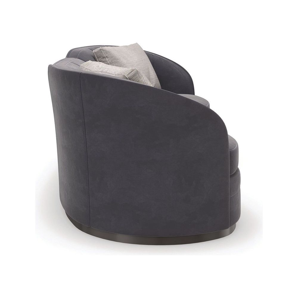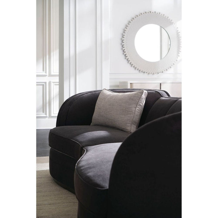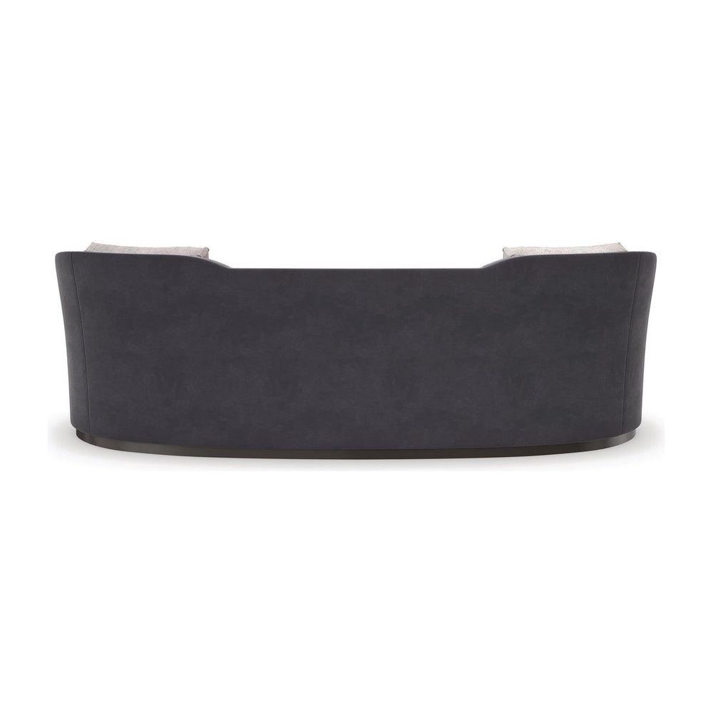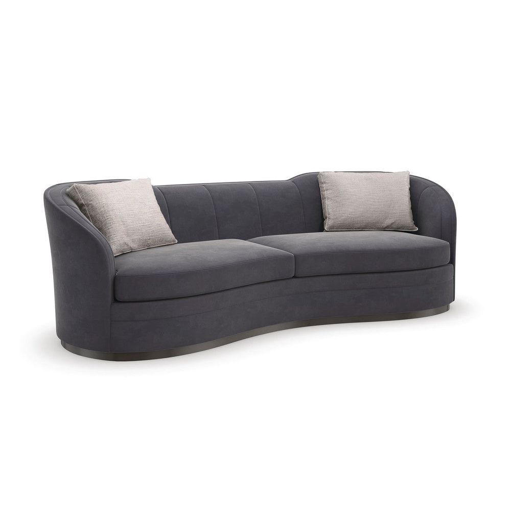 A Dark Chocolate plinth base accentuates this sofa's Art Deco-inspired lozenge shape, masterfully upholstered in a plush charcoal heathered velvet. Designed with two seat cushions that follow its serpentine front and snuggly sit against its softly curving channeled back. Boxed kidney pillows in a grey and ivory ribbed fabric add contrast and a tactile accent. Style in pairs to create an inviting space for entertaining and conversations.