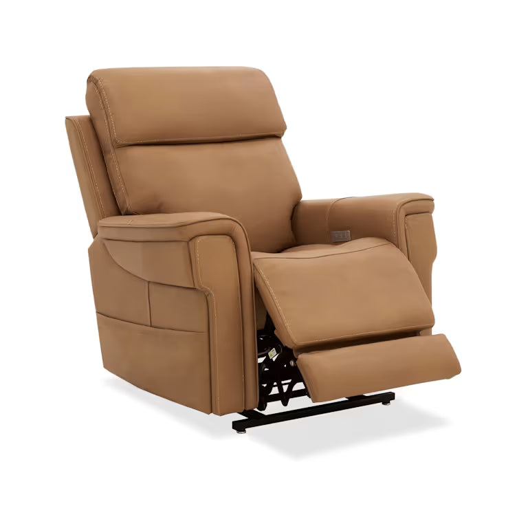 This power recliner combines a full lift function with adjustable lumbar and headrest controls, hidden cupholder, and wireless charging. The rich leather and plush profile offer a thoughtful blend of comfort and functionality in transitional interiors. Hooker Furniture Upholstery is a designer-inspired collection of upscale leather seating that includes versatile reclining chairs, modern-day reclining sofas, eclectic club and artisan accent chairs, as well as a selection of executive desk chairs for the home. Designed and curated to appeal to a variety of style tastes, each piece from Hooker Furniture Upholstery is meticulously crafted in a unique selection of textures and hues.