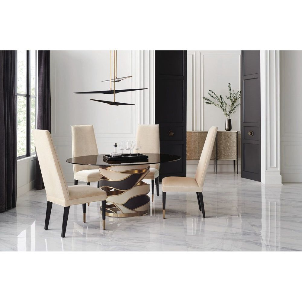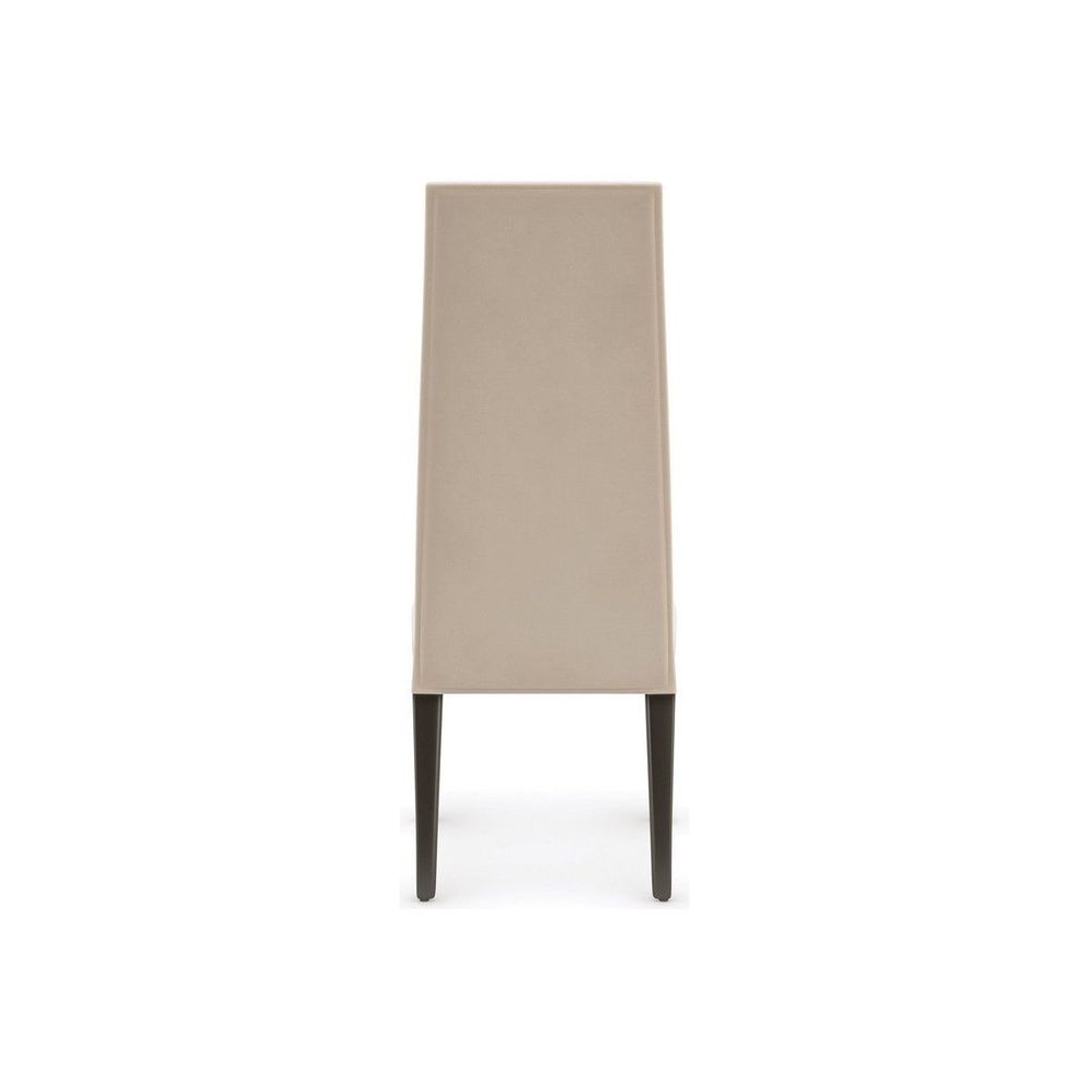 A high-fashion style designed for entertaining, this side dining chair lends a commanding presence. Angular lines and a tall, tapered back are softened by a cream-colored performance velvet that elevates comfort and lets you host worry free. Playing up its exaggerated height: Brushed Gold metal ferrules and lacquered legs in a richly contrasting, Chocolate Truffle finish, for a classic design with cosmopolitan flair.