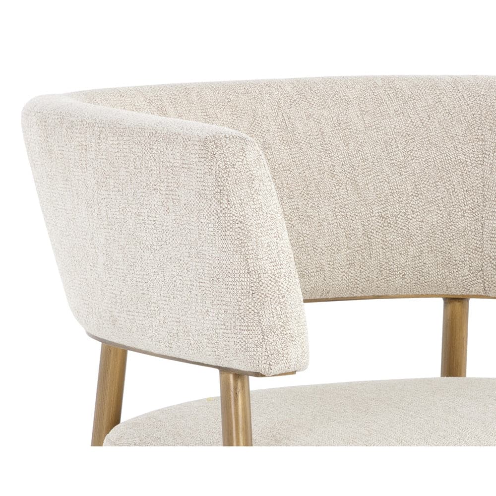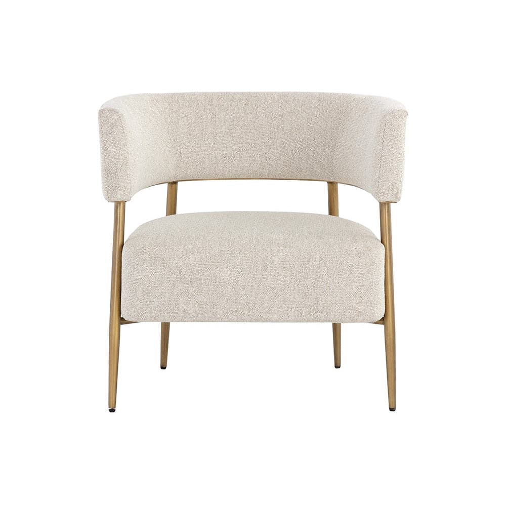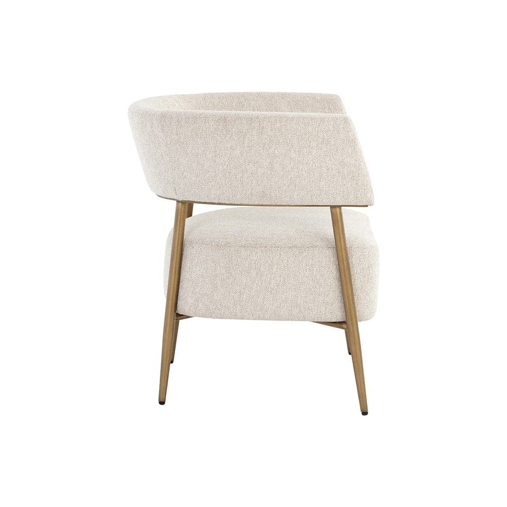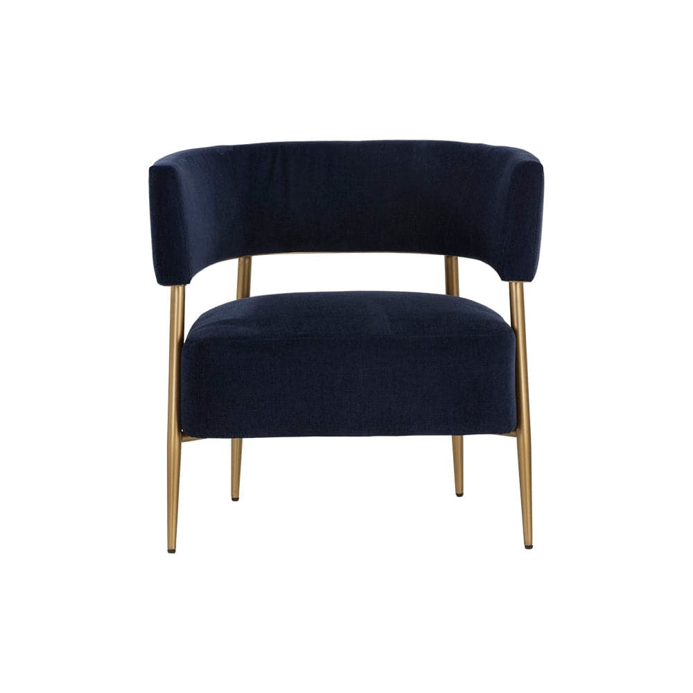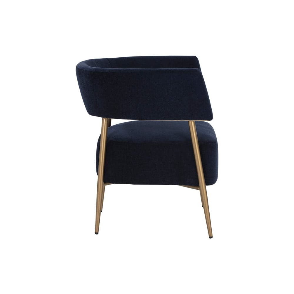 Turn heads with this contemporary lounge chair that exudes extravagance. Features a curved frame and upholstered in our danny rust and navy fabrics. Completed with antique brass legs. Also available in dove cream fabric.