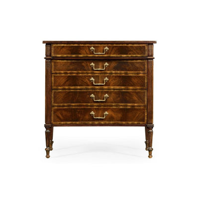 Napoleon III style mahogany veneered and crossbanded chest of drawers with a concave profile, the reeded top above five graduated drawers raised on fluted legs. The top drawer with phone and MP3 charger within.