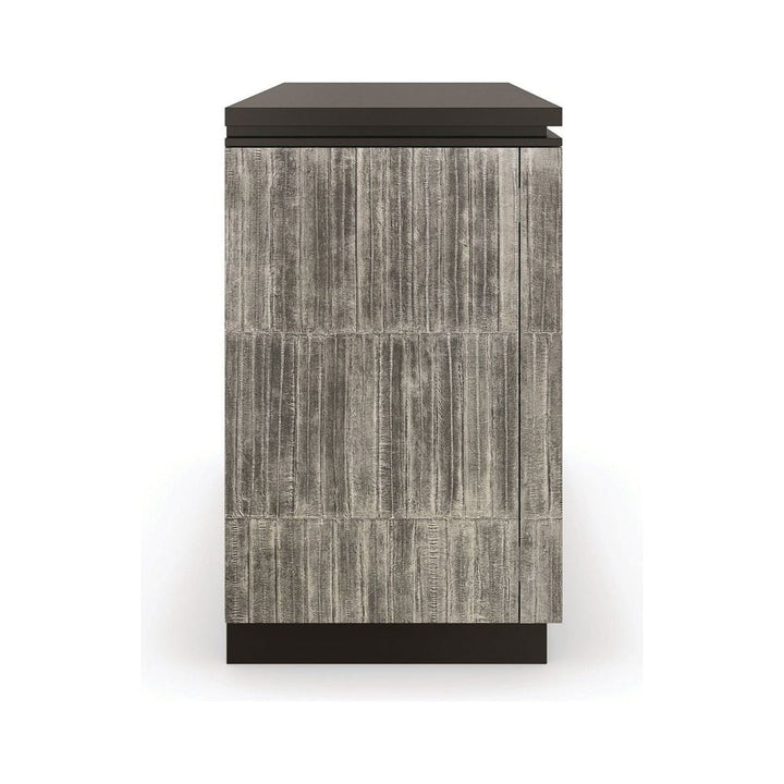 Wrapped in a metallic charcoal paper that emulates eel skin, the Nigiri chest introduces a versatile design with Japanese influence and brutalist styling. Drawing the eye: sleek door fronts adorned with custom two-piece hardware add a note of luxe in Brushed Gold. A streamlined addition to living, dining or home office interiors, Nigiri offers ample space for tucked-away storage with three soft-close drawers and adjustable shelves within its Dark Chocolate-painted interior.