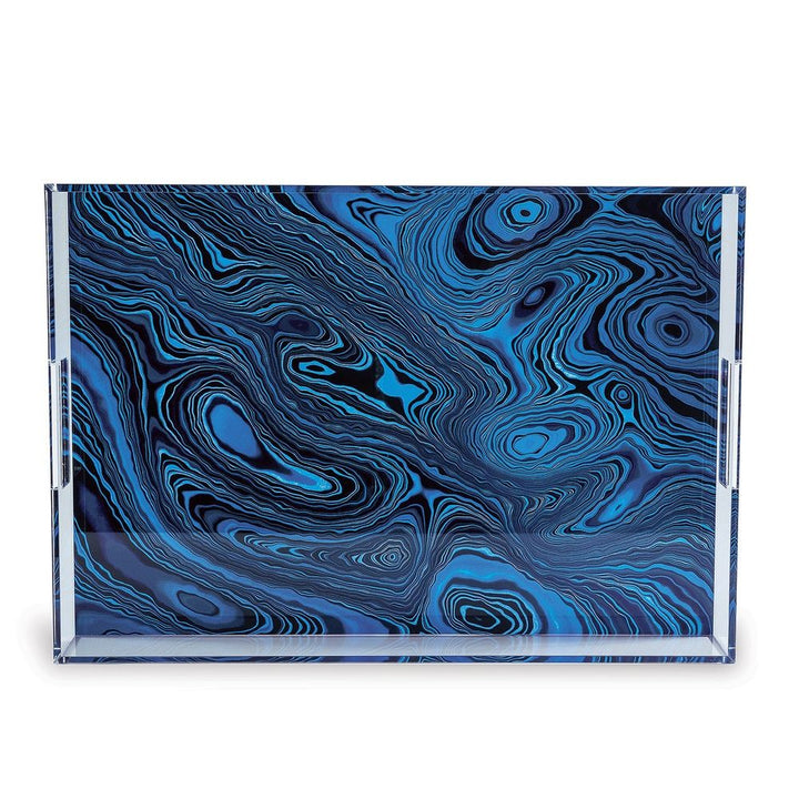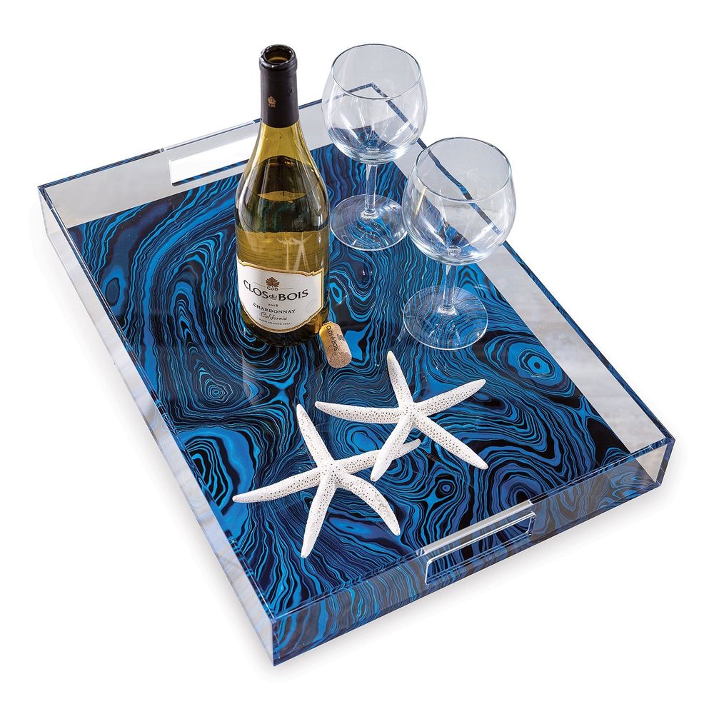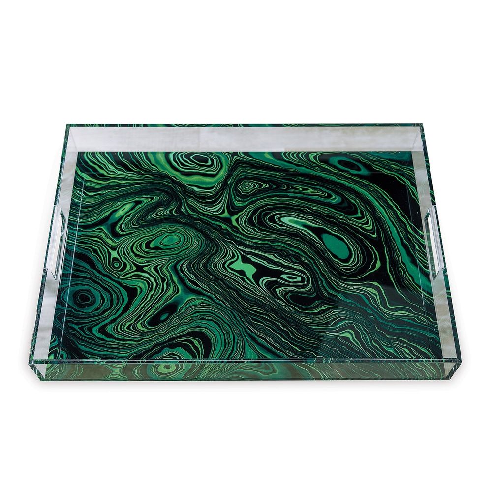 Dramatic green malachite is a striking pattern on our rectangular tray. The malachite pattern is screened on the reverse of the bottom of the Lucite tray.