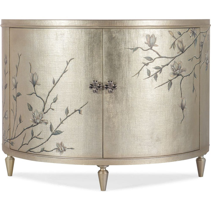 - Finish: Champagne leaf linen with handpainting with silver finished custom flower knobs