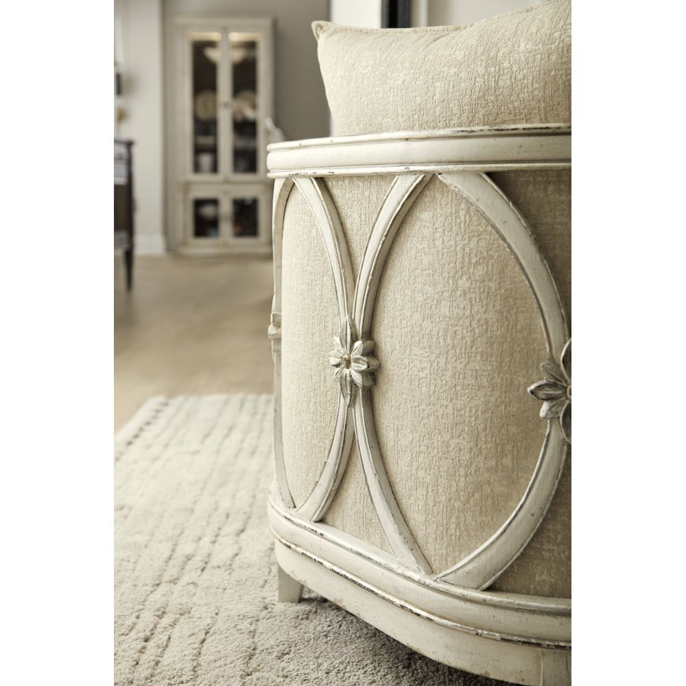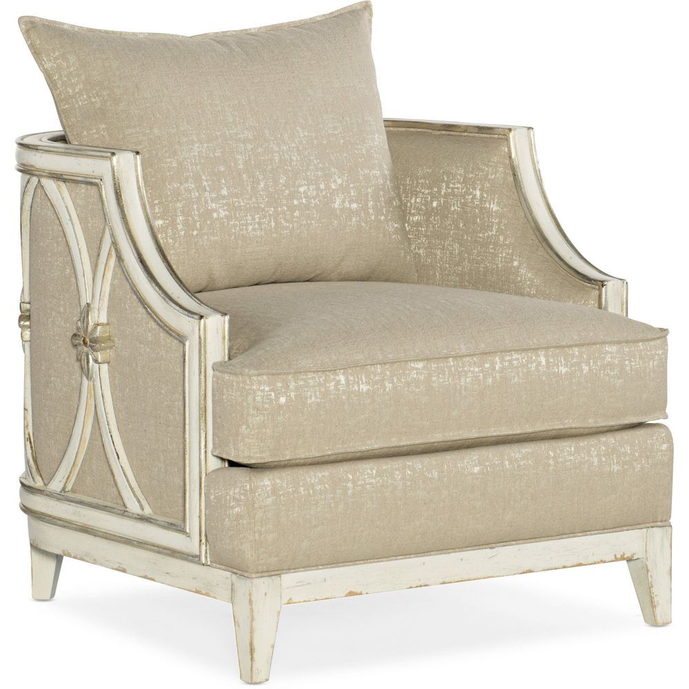 Like resort wear, the Mariette Lounge Chair is casual and breezy yet elegant. The striking wood frame features repeated ovals around the sides and back, punctuated by center flower medallions. The dreamy Chalet finish is a two-tone color combining Latte, a light wood and Blanc, a creamy white accented with champagne and silver tipping. The Glitter Pearl performance fabric is shimmery and soft. Loose pillow back. Channeling jet setting socialites from the golden age of Hollywood as its muse, Hooker Furniture is set to launches a major expansion to its popular Sanctuary collection. The bedroom, dining room, occasional and home office pieces are grouped into three unique new personas, each of which embody the influences of the iconic starlets whom left impressions of glamour, charm and class on American pop culture. From bold and dramatic to soft and romantic to a statement-making eclectic lifestyle, the three personas - Collette, Anastasie and Diamant - effortlessly bring to life a well-traveled socialite who has curated a collection of home furnishings in her metropolitan home that tell the story of her travels across the globe. Anastasie offers a softer, romantic look with its creamy white finish that is accented with champagne and silver tipping. Several historical reproduction styled pieces in a two-tone finish are intermingled throughout, giving the group a bit of a traditional European cottage style. Additional design details include table tops with intricate quatrefoil veneer patterns crafted with oak and a mix of unique walnut inlay, carved chairs with acanthus leaf and scrollwork detailing and champagne tipped eglomise.
