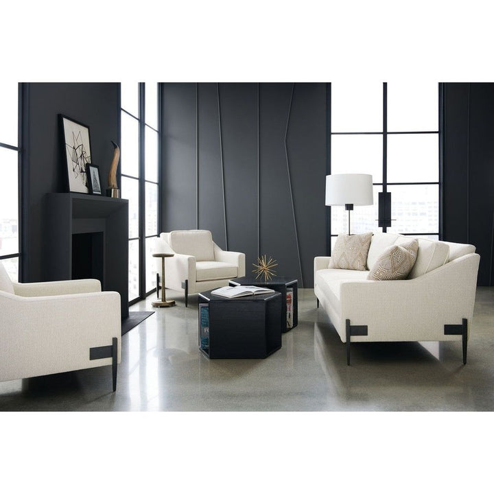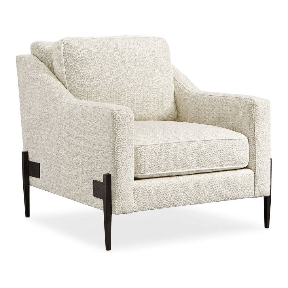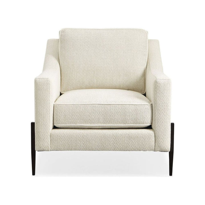 Modern meets classic in the perfect remix represented in this marvelous chair. Its timeless silhouette feels updated and relevant with a suspended frame, metal flange detailing and cast-metal tapered legs all wearing a bold Black Iron finish. Its sumptuously comfortable seat is upholstered to perfection in a wooly, textured body fabric that feels as delightful as it looks. A woven leather decorative welt outlines the slope of this reimagined track-arm chair while lending an element of organic harmony.
