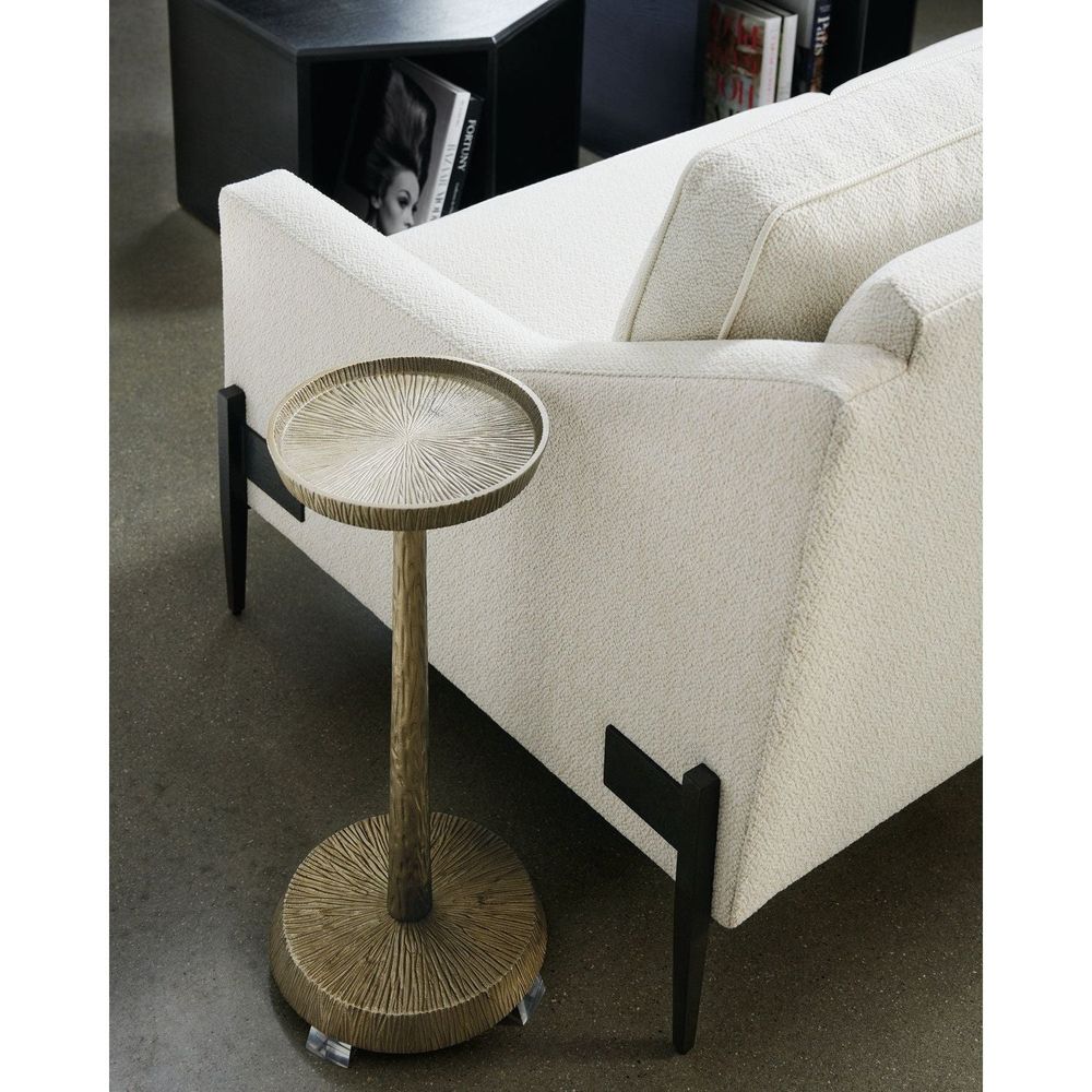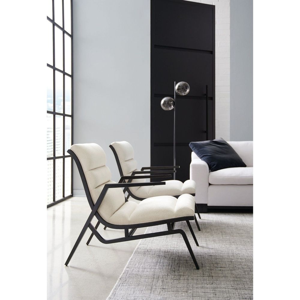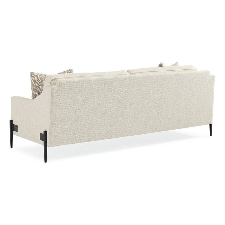 Modern meets classic in the perfect remix of this marvelous sofa. Its timeless silhouette feels updated and relevant with a suspended frame, metal flange detailing and cast-metal tapered legs all wearing a bold Black Iron finish. Its sumptuously comfortable seat is upholstered to perfection in a wooly, textured body fabric that feels as delightful as it looks. A woven leather decorative welt outlines the slope of this refreshing sofa while lending an element of organic harmony.