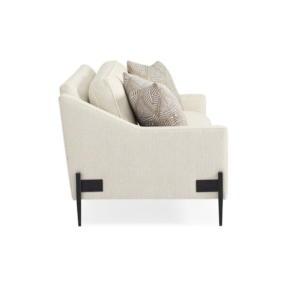 Features: Slim tapered metal legs with decorative bracket.Loose seat and back cushions.