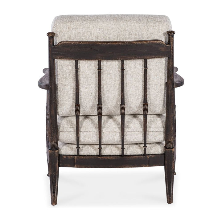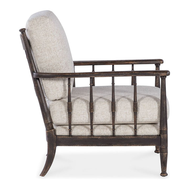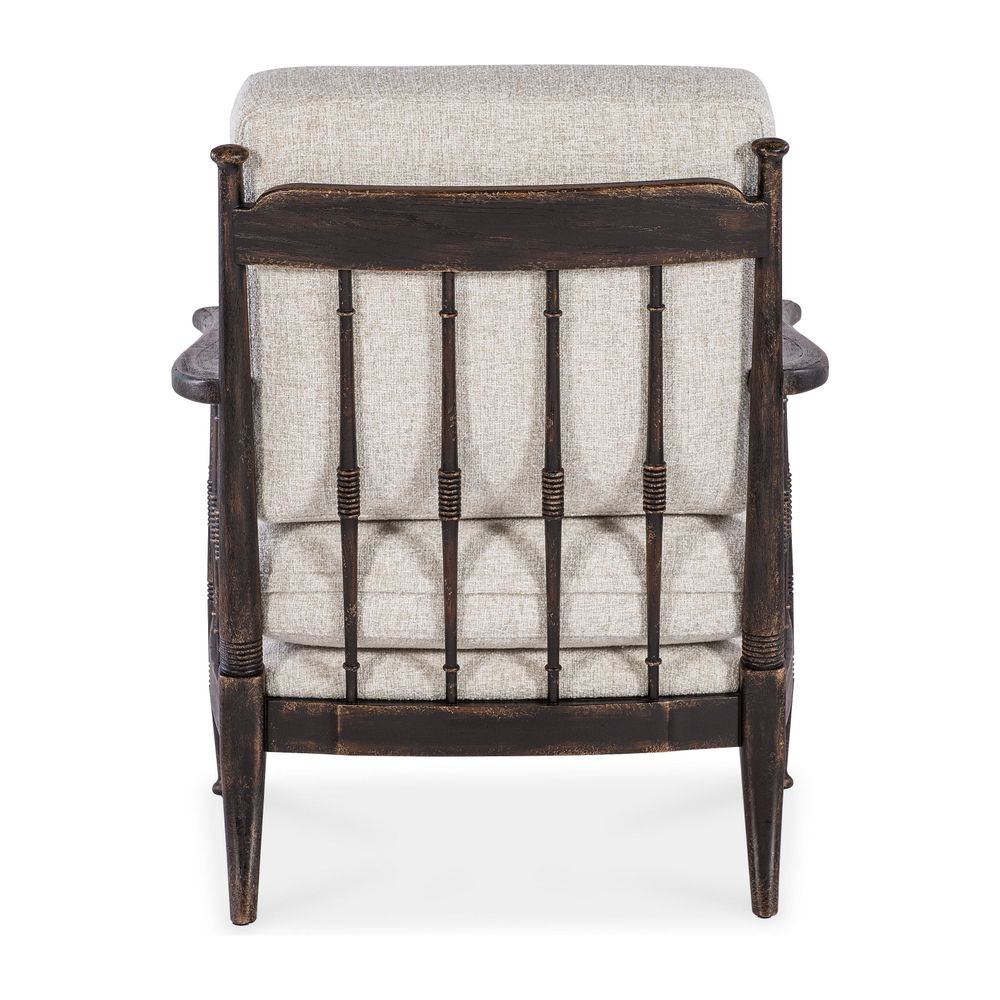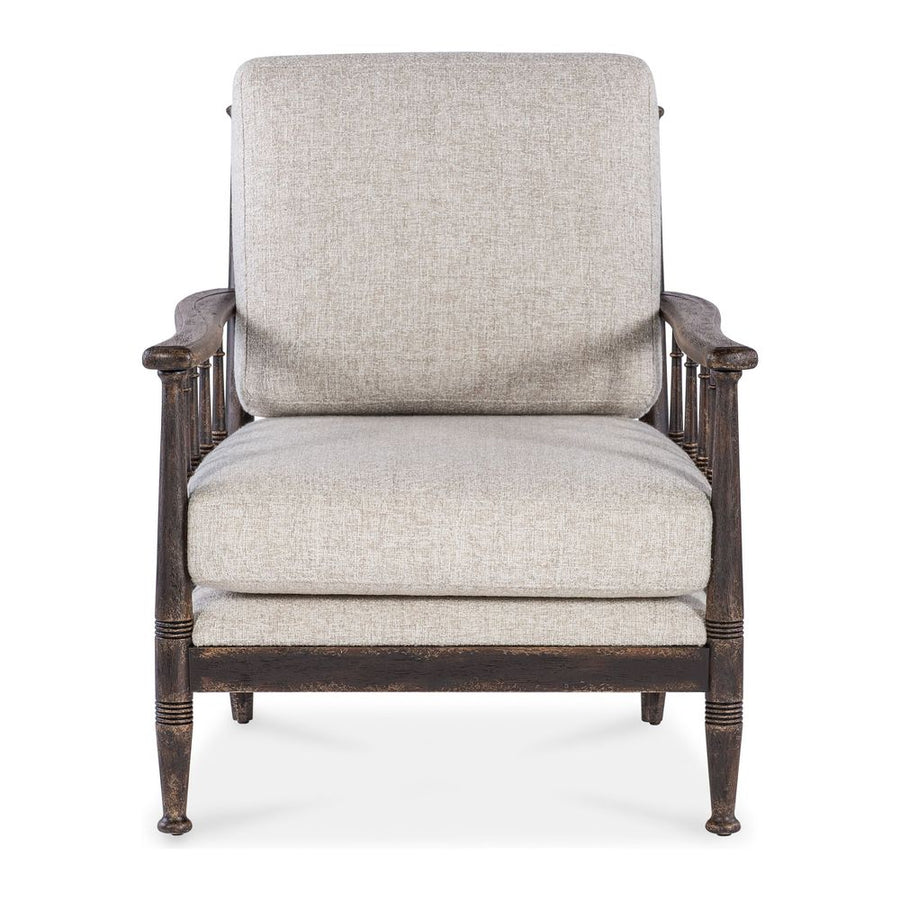 Description: In a classic, charming design with a nostalgic flair, the Meadow Upholstered Chair has vintage spindle arms and back with carved ribbed accents, finished in Heritage Molasses, a deep dark tone over Cathedral Oak Veneers that captures the essence of a well-loved heirloom. The upholstered seat and back are covered in the 100% Linen Biscuit fabric.