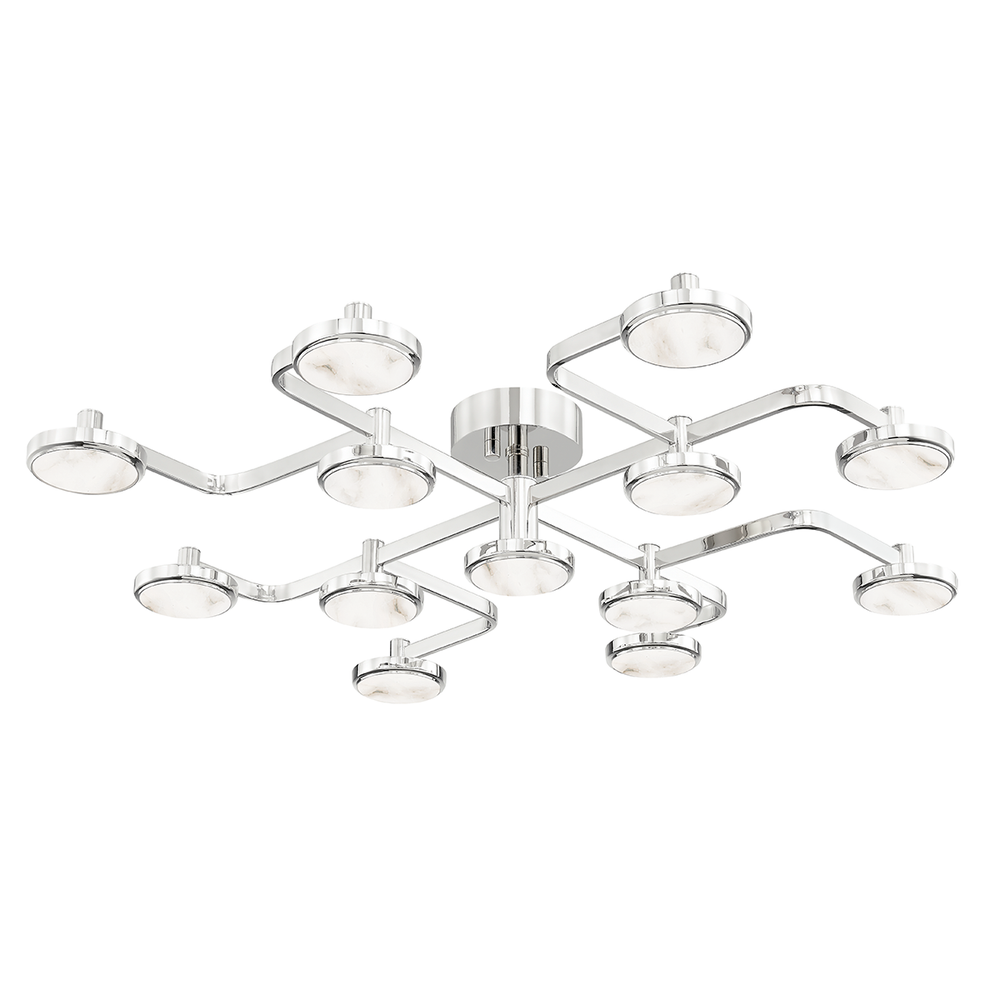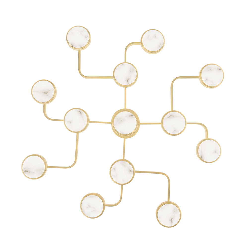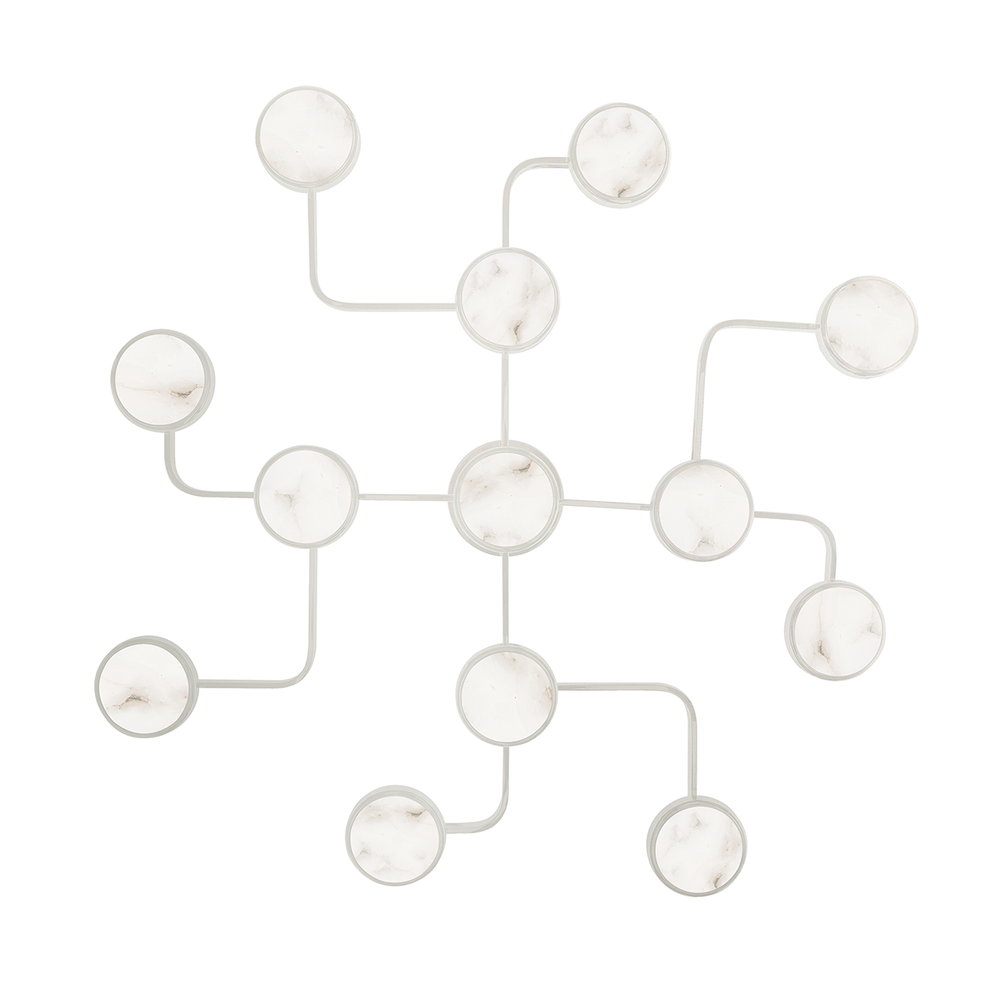 Soft yet strong, large-scale yet close to the ceiling, Meander is a study in contrasts that forges its own path. Inspired by the view of a large city at night, a series of individual lights come together to create beauty. White Spanish alabaster diffusers give the piece a luxe look. Available as a stunning chandelier or a one-, three-, or five-light sconce. Three- and five-light sconce can be mounted horizontally or vertically.