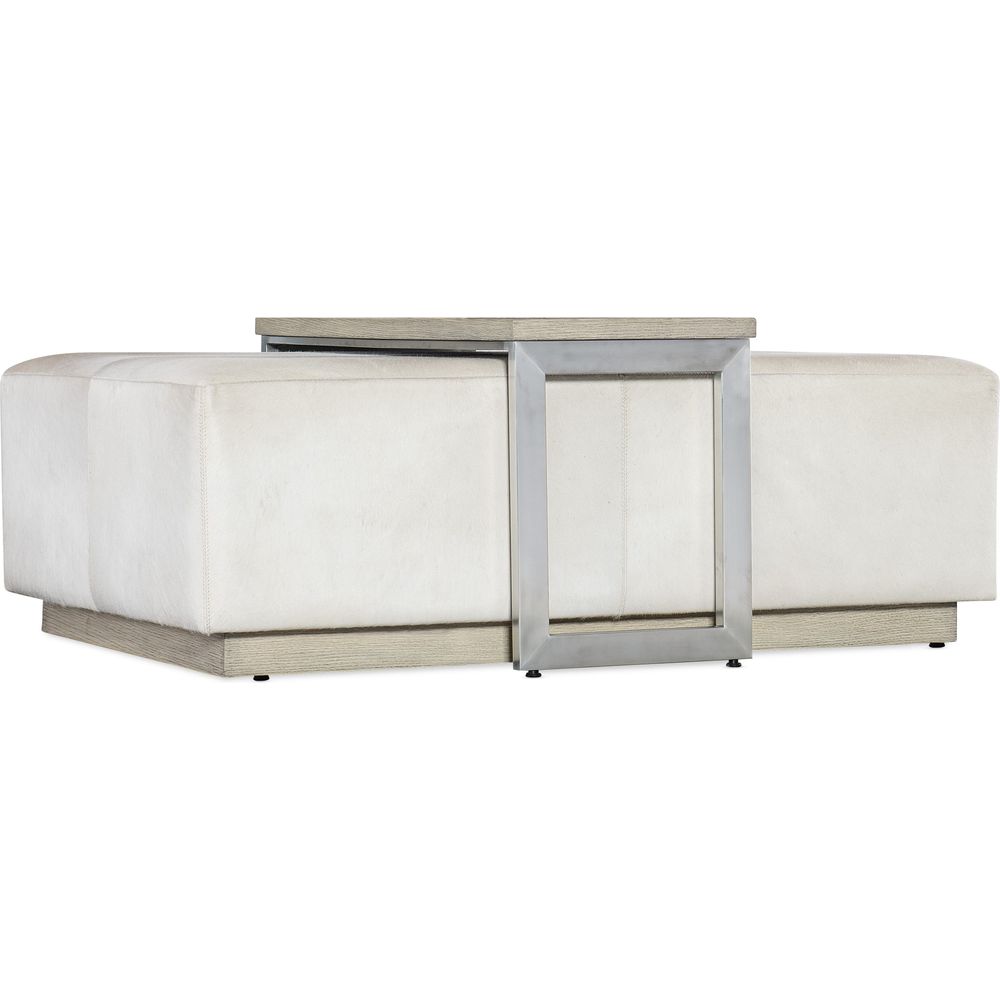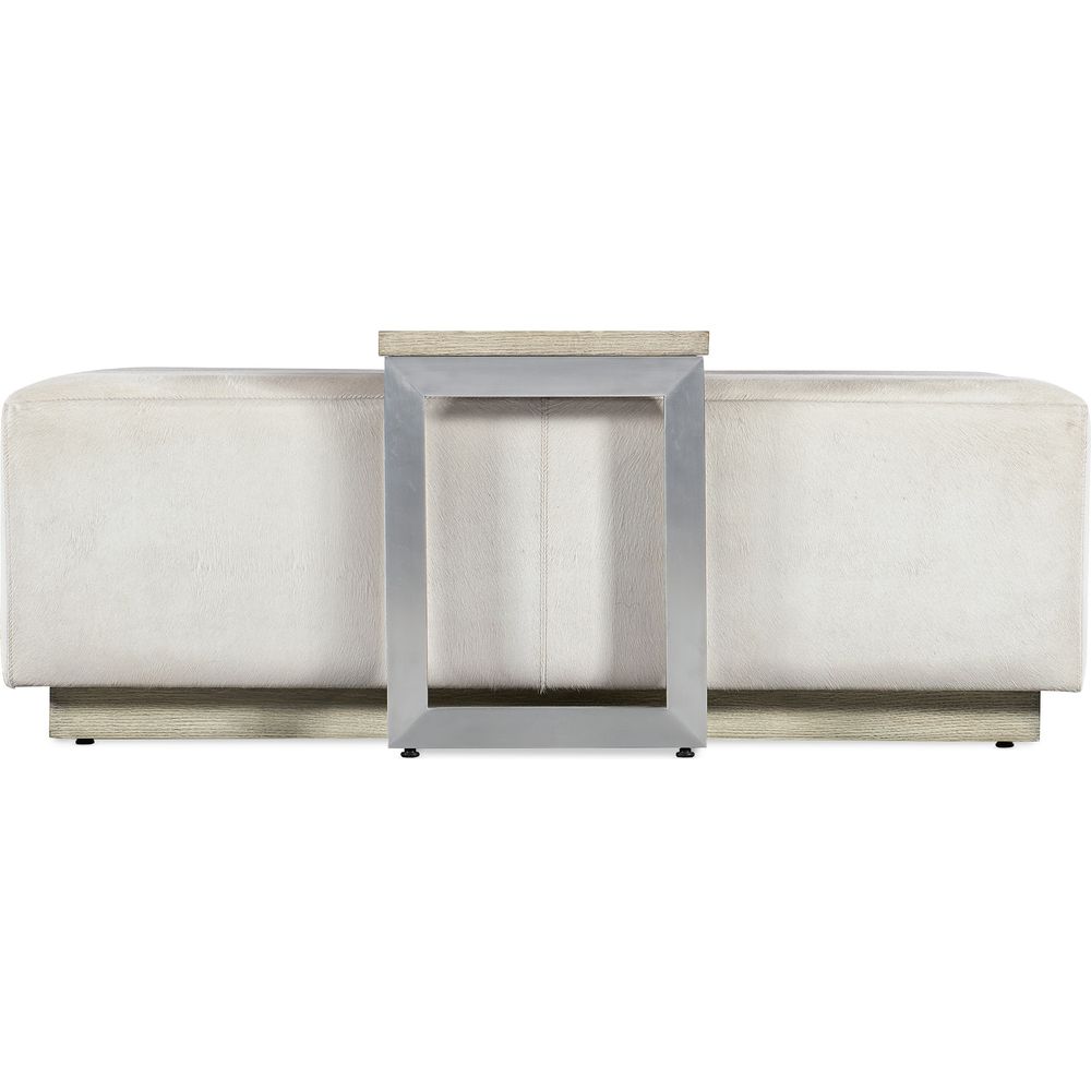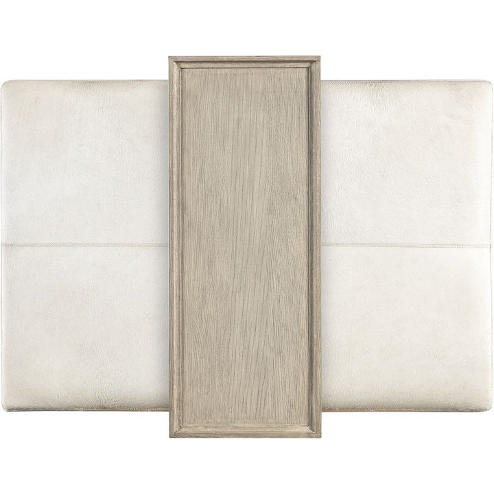 Description: In a user-friendly modern design, the rectangle-shaped Bridged Cocktail Table is upholstered in cream-colored hair-on-hide leather and features a convenient mobile tray top for keeping beverages, snacks or electronics within reach. The tray-top legs are metal-wrapped with a light-finished wood top that matches the wood plinth base.