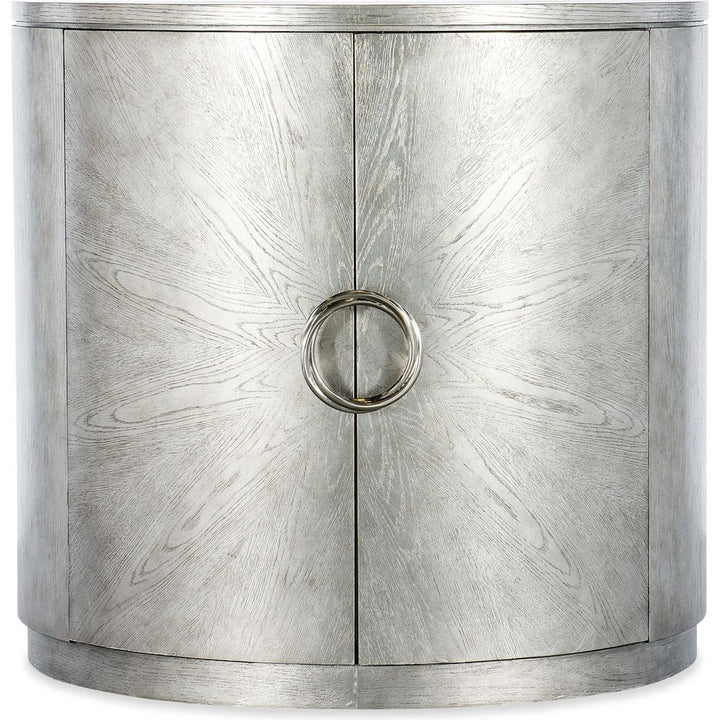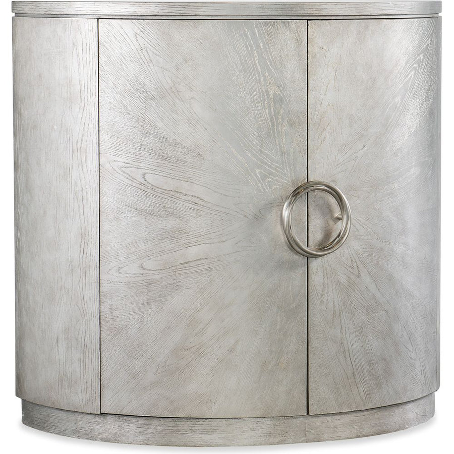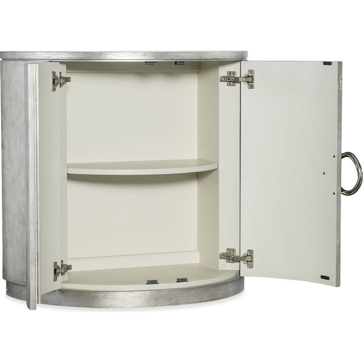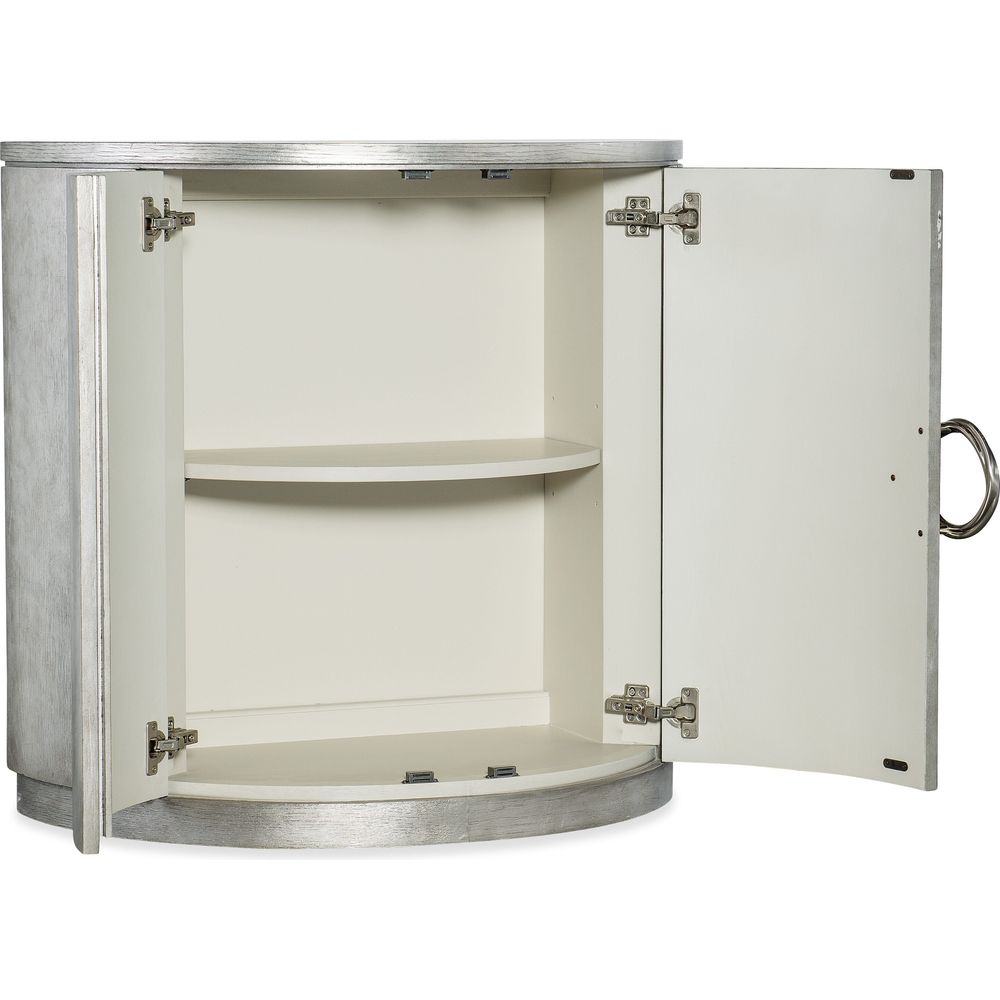 Description: Classy, tasteful and understated, the Deserie Chest is in a timeless demilune shape, crafted of Oak Veneers with a silver leaf finish and silver-colored round twist hardware. Behind the doors is one adjustable shelf and a cream interior.
