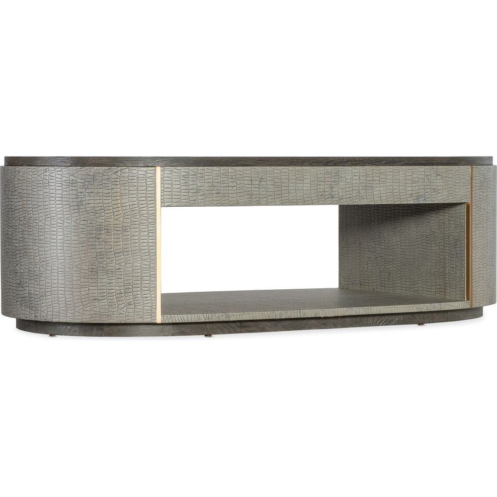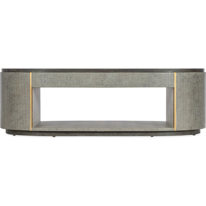 Description: With the design flair of a luxurious fashion accessory, the Dylian Coffee Table has a gray crocodile exterior with gold metal accents and a dark wood top and base. Crafted of Pine Veneers and Robus Leather, it has an oval shape with an open shelf area.