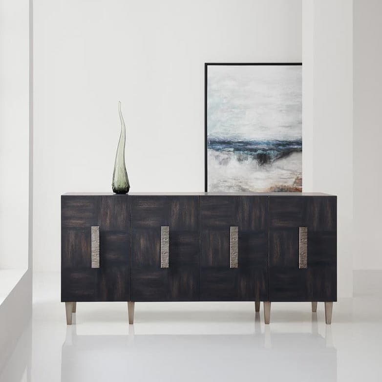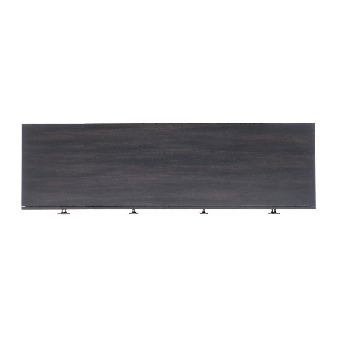 - Finish: Dark walnut finish with textured pewter metal hardware. Distressing includes rasping, chopping, and wormholes.