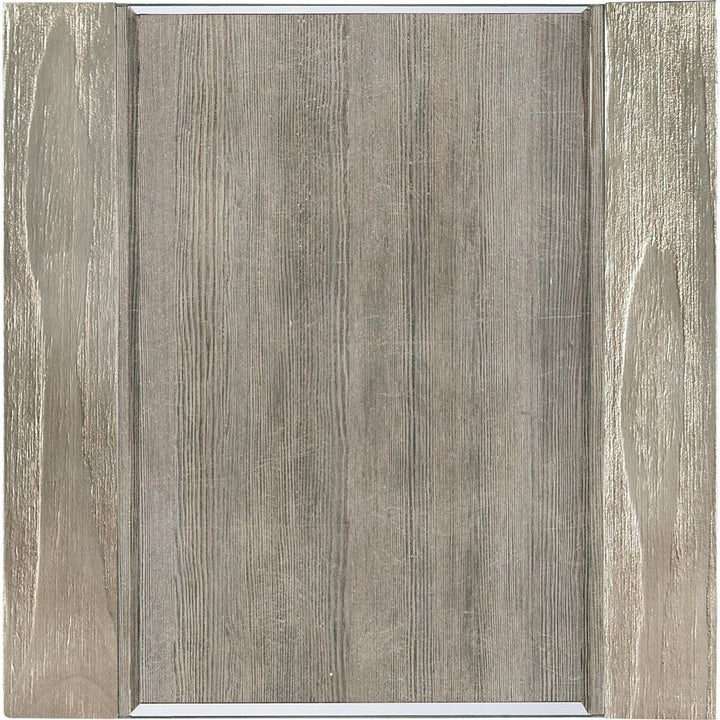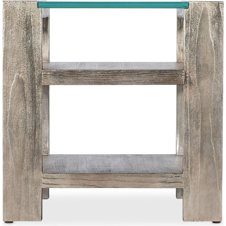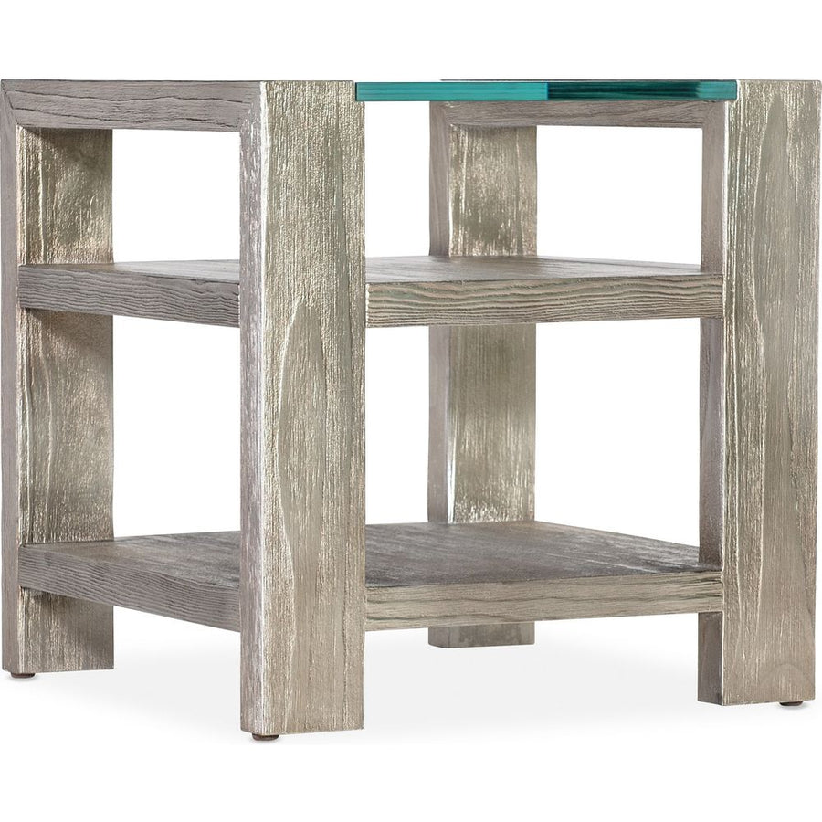 Description: The authentic wood grain of Pine Veneers is showcased by the unexpected silver leaf finish on the chic Melange Saber End Table. Featuring a drop-in tempered glass top and two fixed shelves, the table is 25 inches square.
