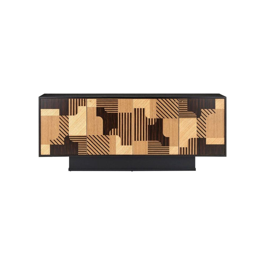 Description: Inspired by the famed design movement, the Memphis Credenza illustrates the bold patterns inherent in the style. This piece brings the utmost sophistication to the motifs in a mix of natural oak, Mindi wood in an espresso finish, black Macassar ebony, and mahogany. The scale of the plinth base, which she pulled in and designed to echo the proportions of the credenza, makes the brown and tan credenza look as if it is floating. The polished cast-brass door pulls are so tiny, they all but disappear.