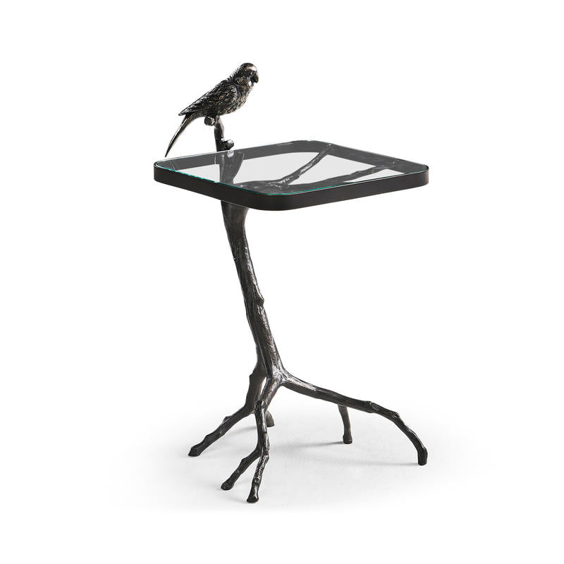 Description: Inspired by nature, the Mendenhall Accent Table is a captivating blend of artistry and function. Its bronzed iron base, designed in an intricate branch motif, brings an organic elegance to the room. Perched atop the glass tabletop is a delicate bird sculpture, adding a whimsical and sculptural touch to the design. The clear glass surface beautifully showcases the intricate detailing of the base, making this accent table a true conversation piece.