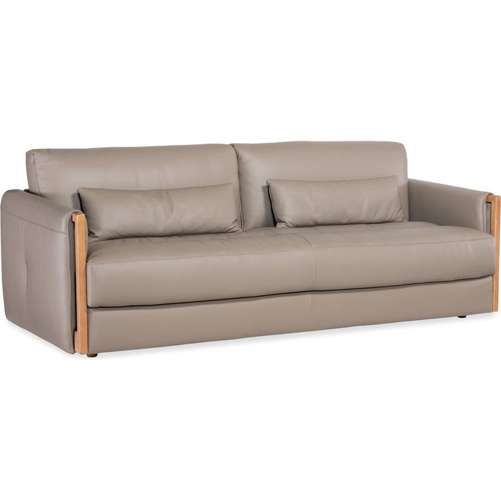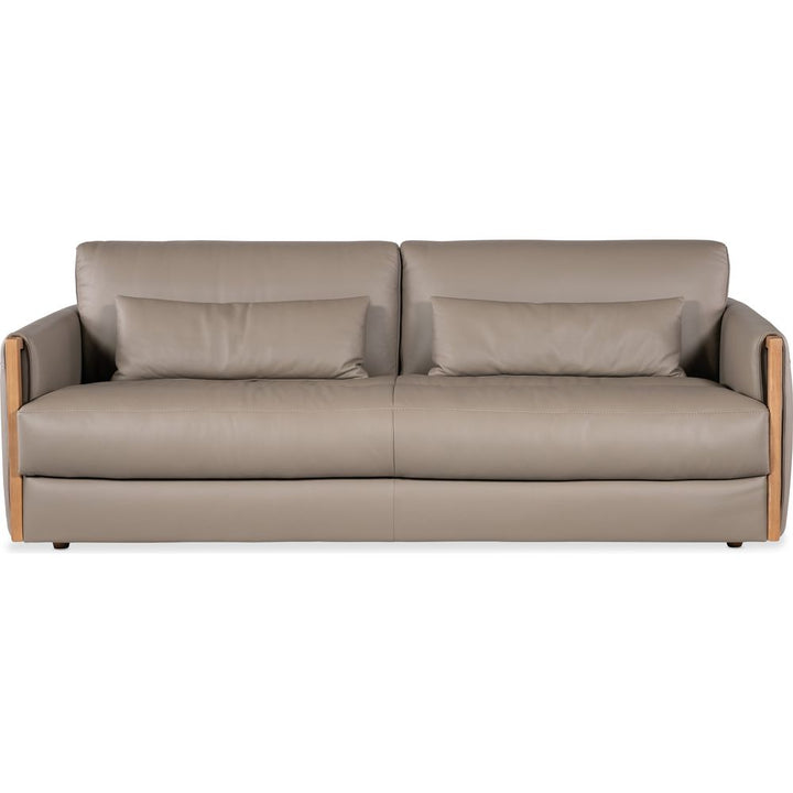 Description: In a light and airy modern style, the Meridian Sofa has exposed wood trim on the arm fronts and is covered in the soft-colored Miami Truffle semi-aniline top grain leather, accented by designer topstitch trim and two kidney pillows.